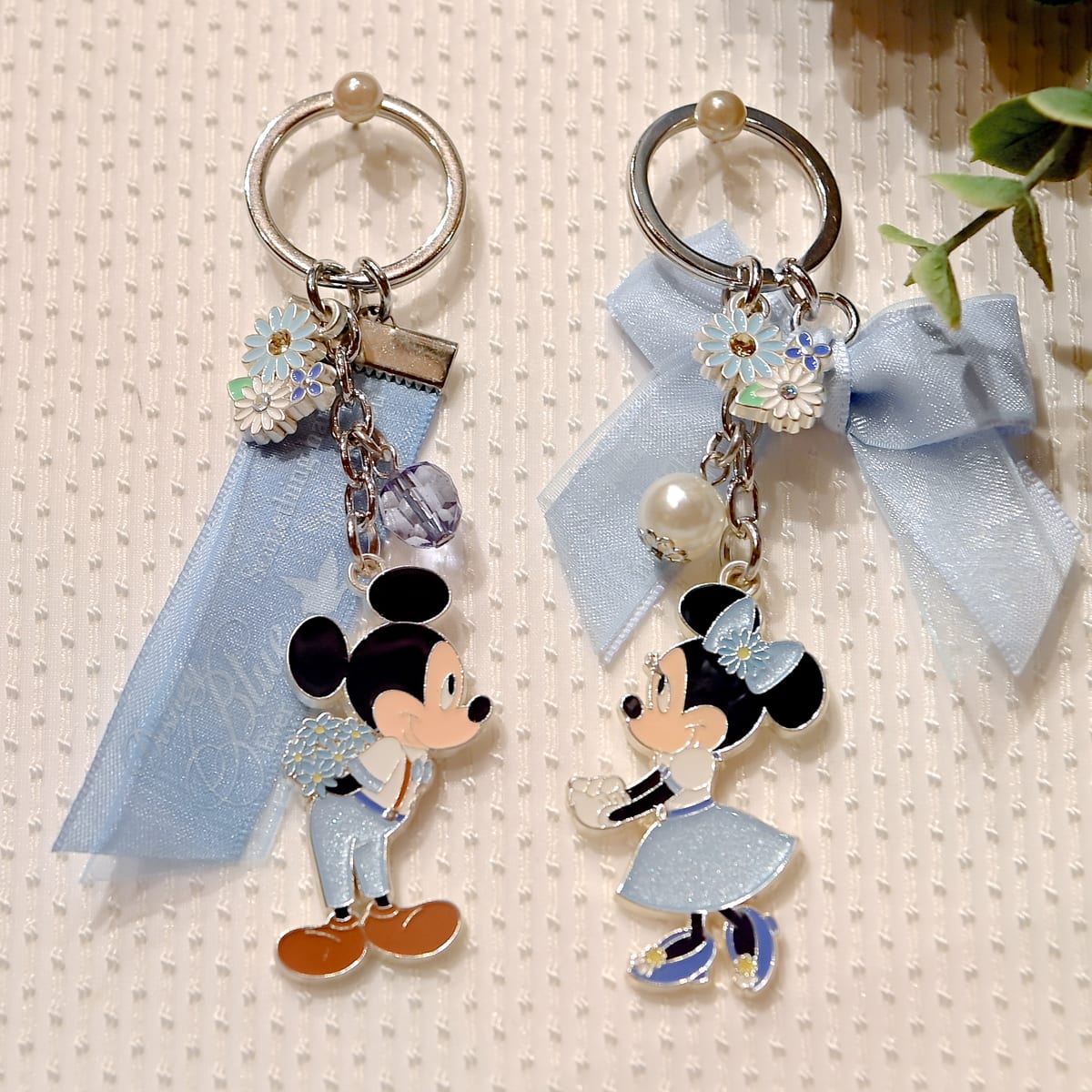 「ミッキーマウス」と「ミニーマウス」のリボンキーチェーンセット。