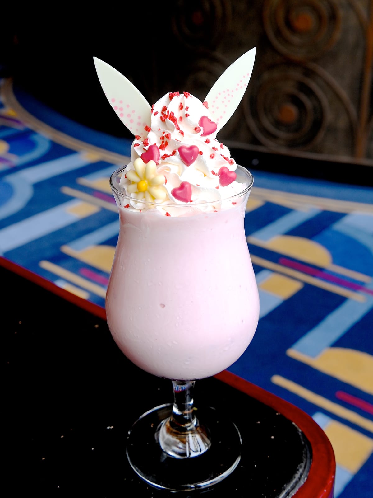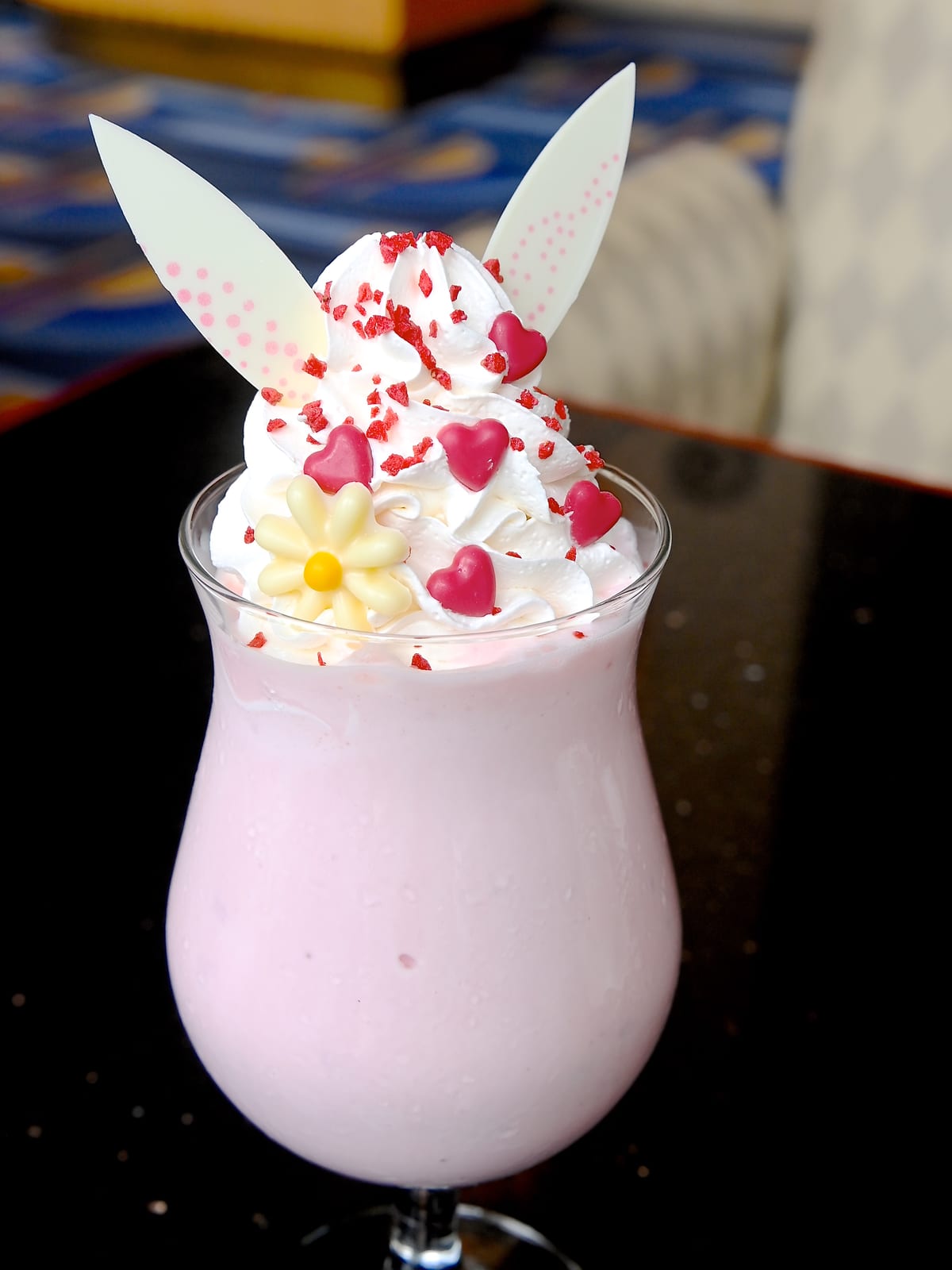 ストロベリーアイスクリーム、ミルク、ストロベリーシロップ、キャラメルシロップ、一番下にブルーベリーソース、たっぷりのホイップクリーム、ストロベリークリスピー、うさ耳風、お花、ハートのチョコレートがトッピングされたお子様でもいただきやすいデザートドリンクメニューです。