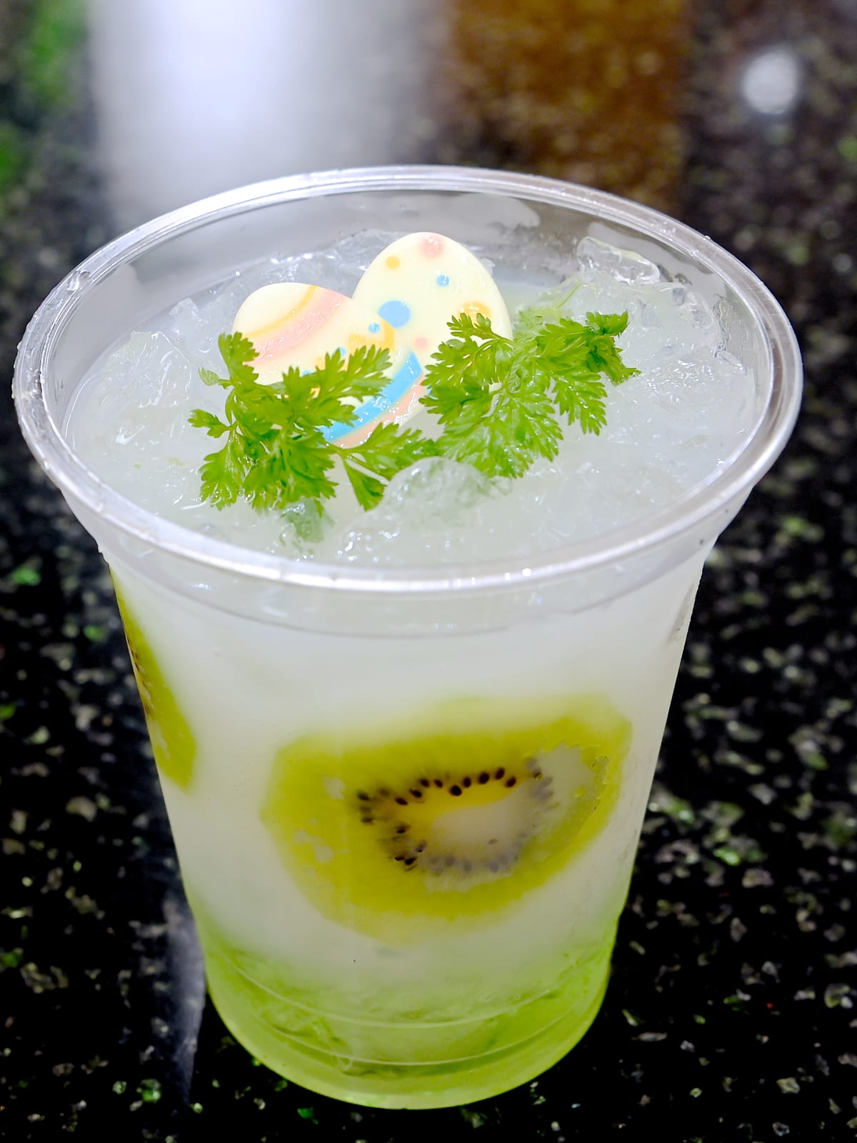 グリーンの春らしいドリンクにはイースターエッグ型のチョコレートとハーブがトッピングされています。
