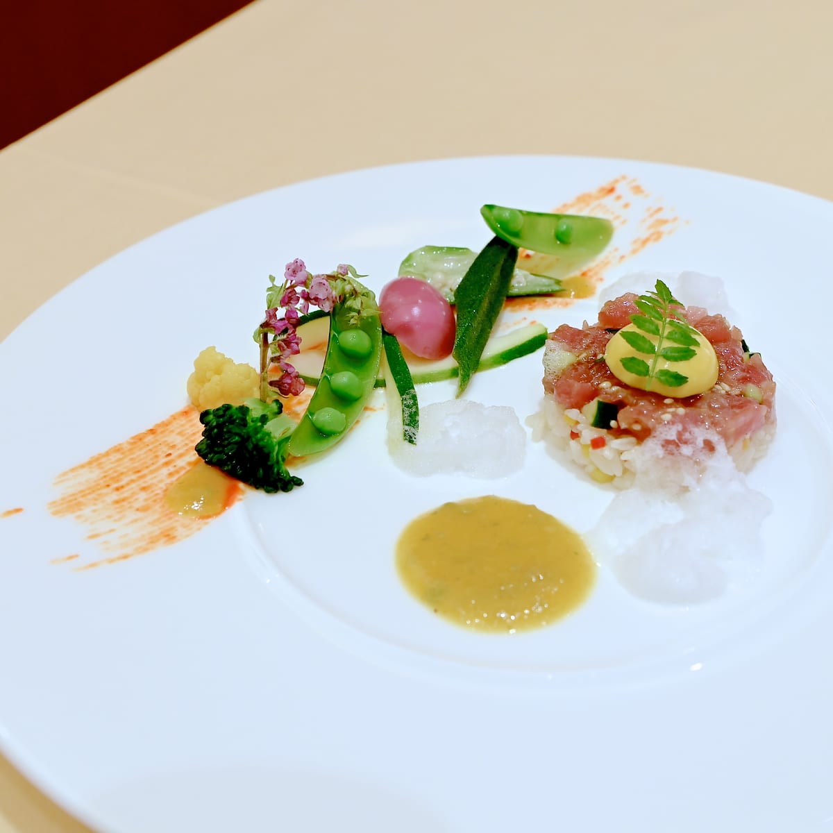 • マグロとカルローズ米のアヒポキ仕立て 山椒風味のイエローベルペッパーソース(アメリカ産米)