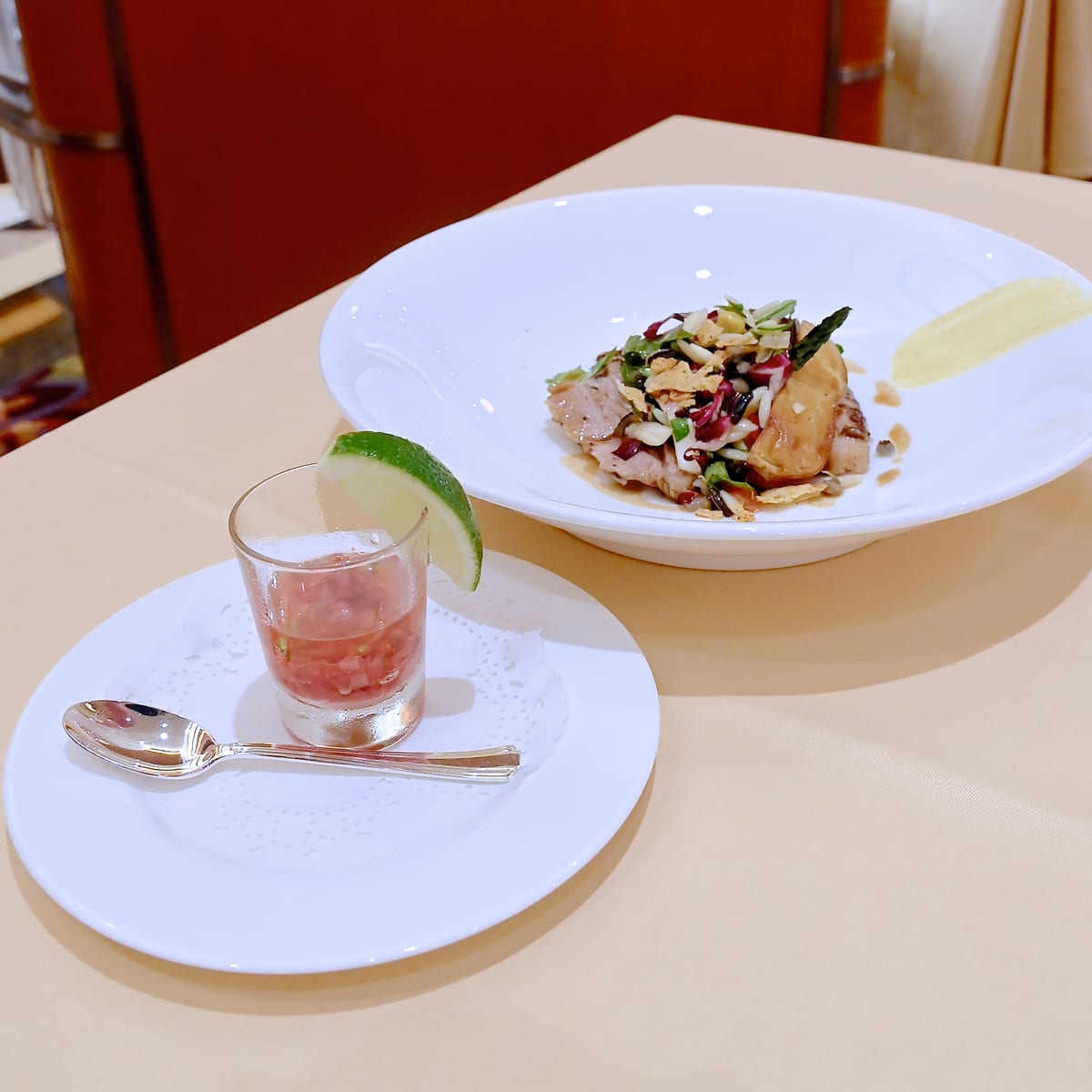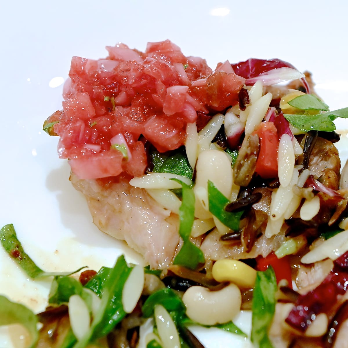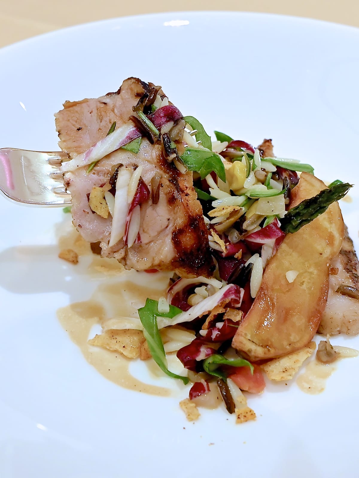 プラチナポークのコンフィグリル ライムとシラントロのサルサ ワイルドライスとリゾーニのチョップドサラダ1