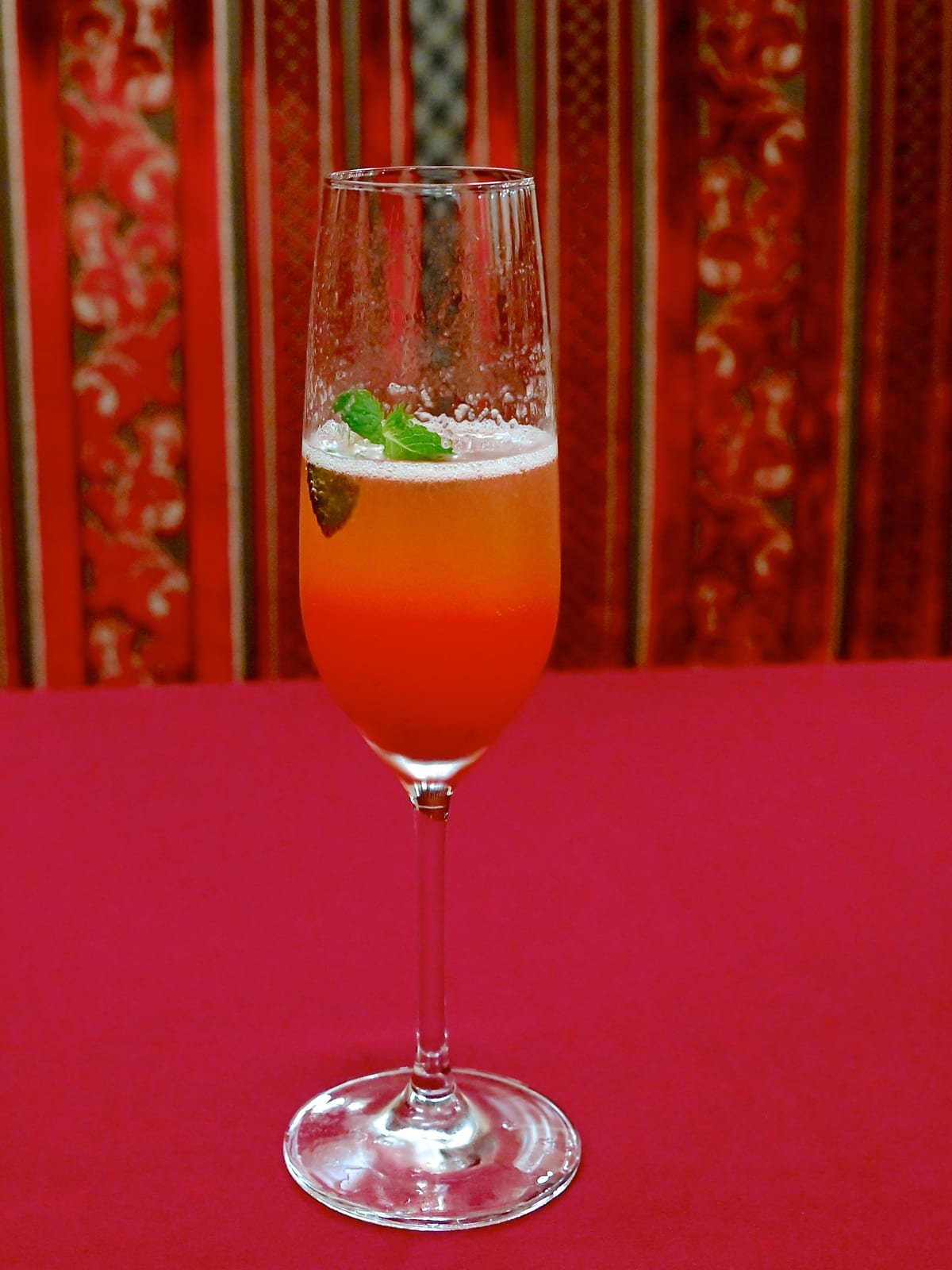 ストロベリーソースとシャンパンにミントがトッピングされたオリジナルカクテル(ストロベリー)。