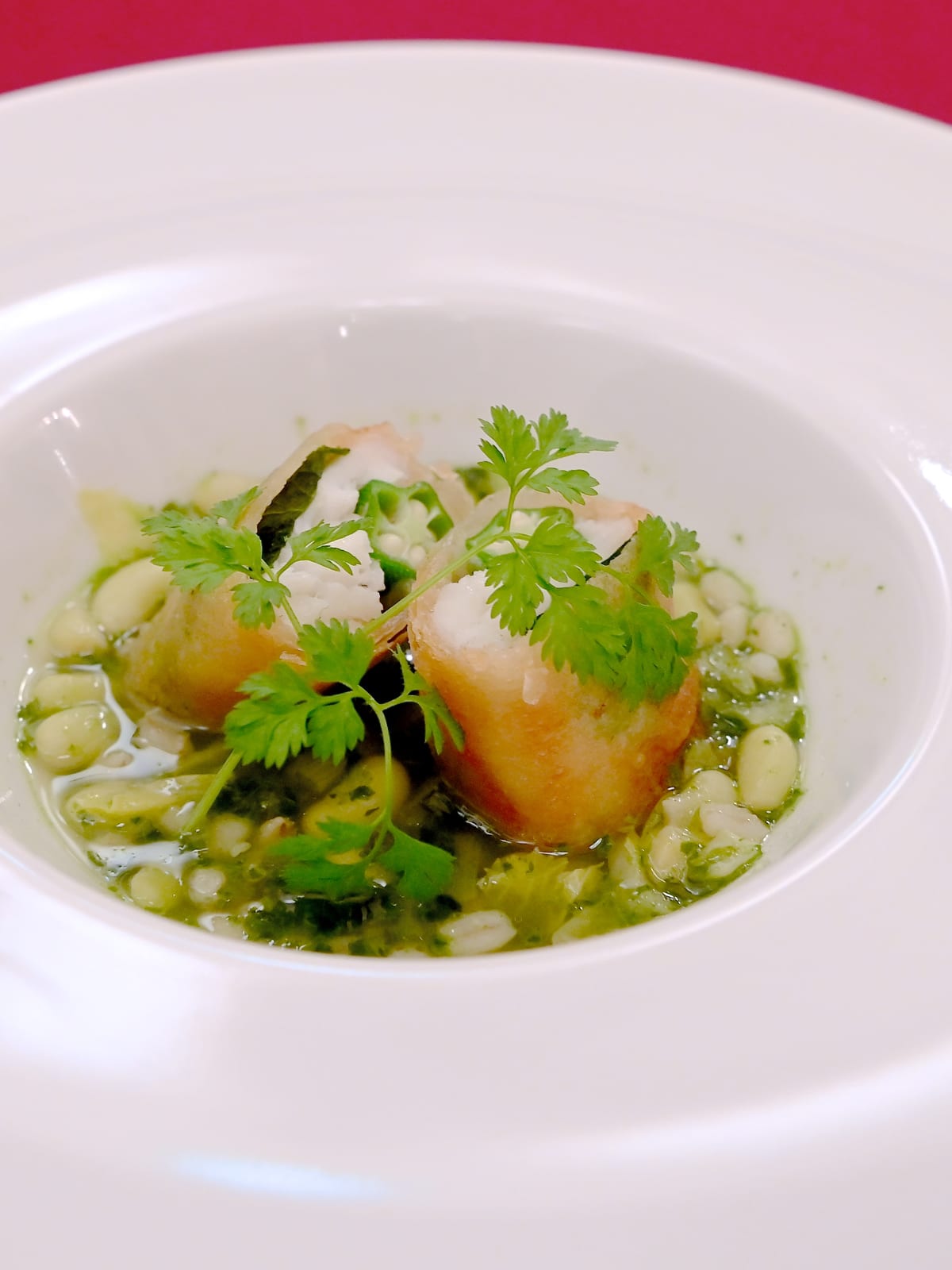 • 真鯛の包み揚げ、フラジョレ豆のスープ