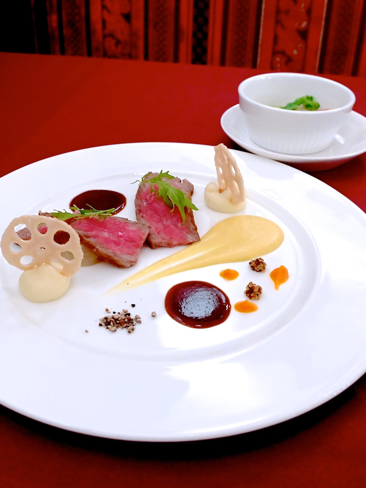 赤ワインのソース、黄色のソース(スクランブルエッグ)、マスタードや人参のピュレと一緒にいただきます。