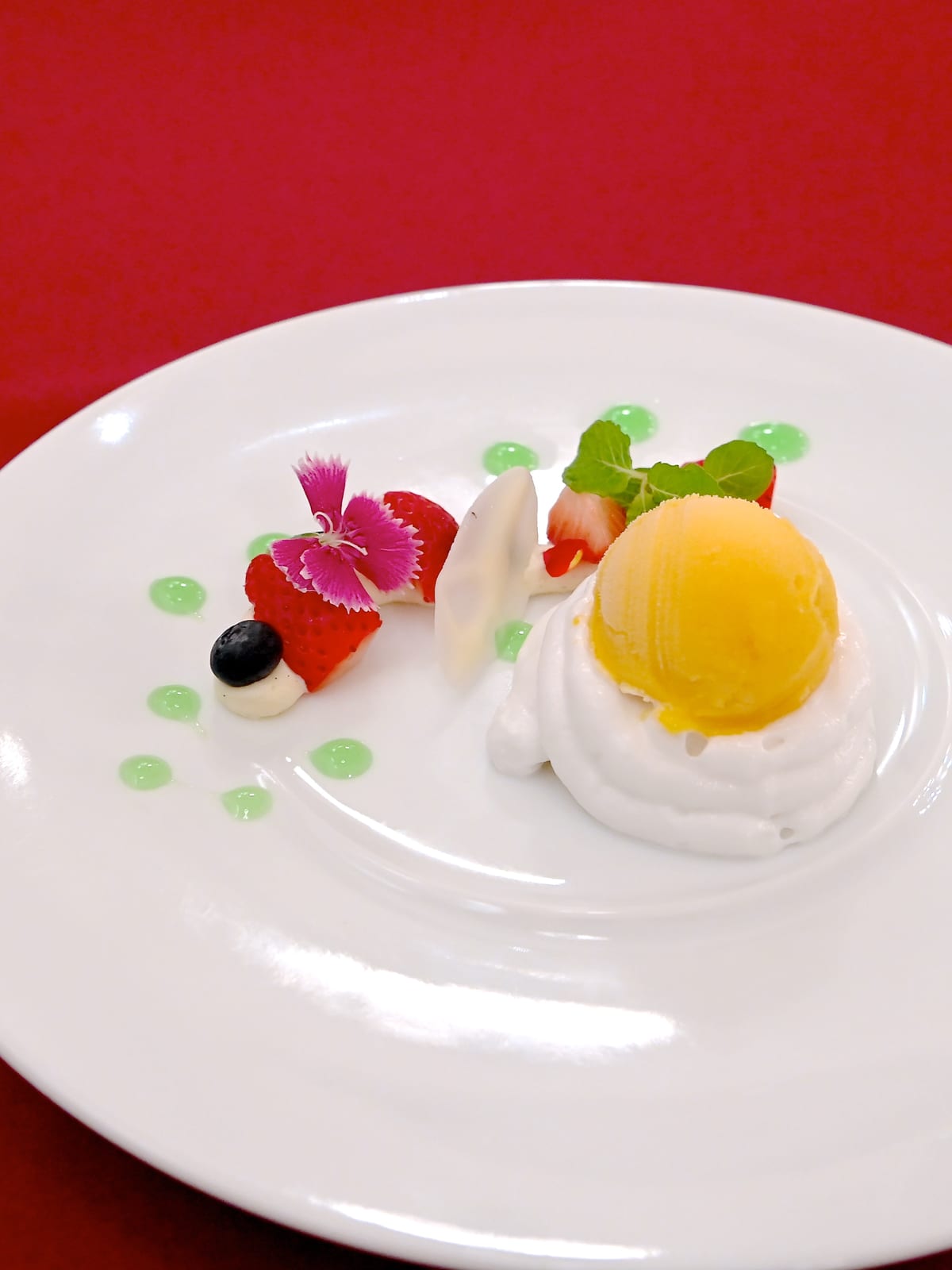 デザートは、イースターらしい見た目もかわいらしい「マンゴーのシャーベットとココナッツエスプーマ」