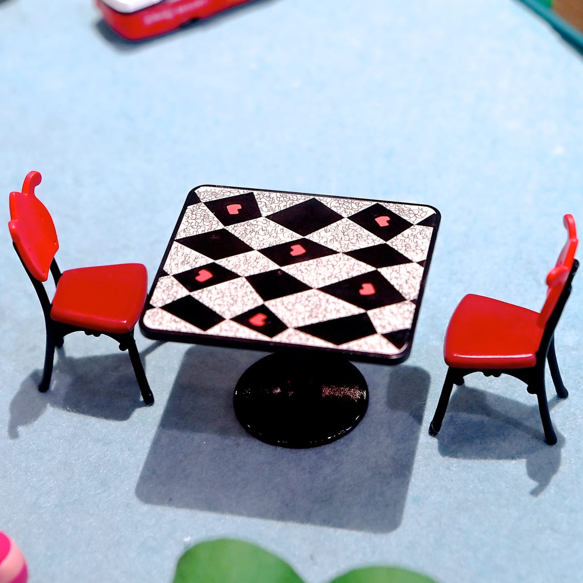 クイーン・オブ・ハートのバンケットホールのテーブルと椅子のフィギュア。