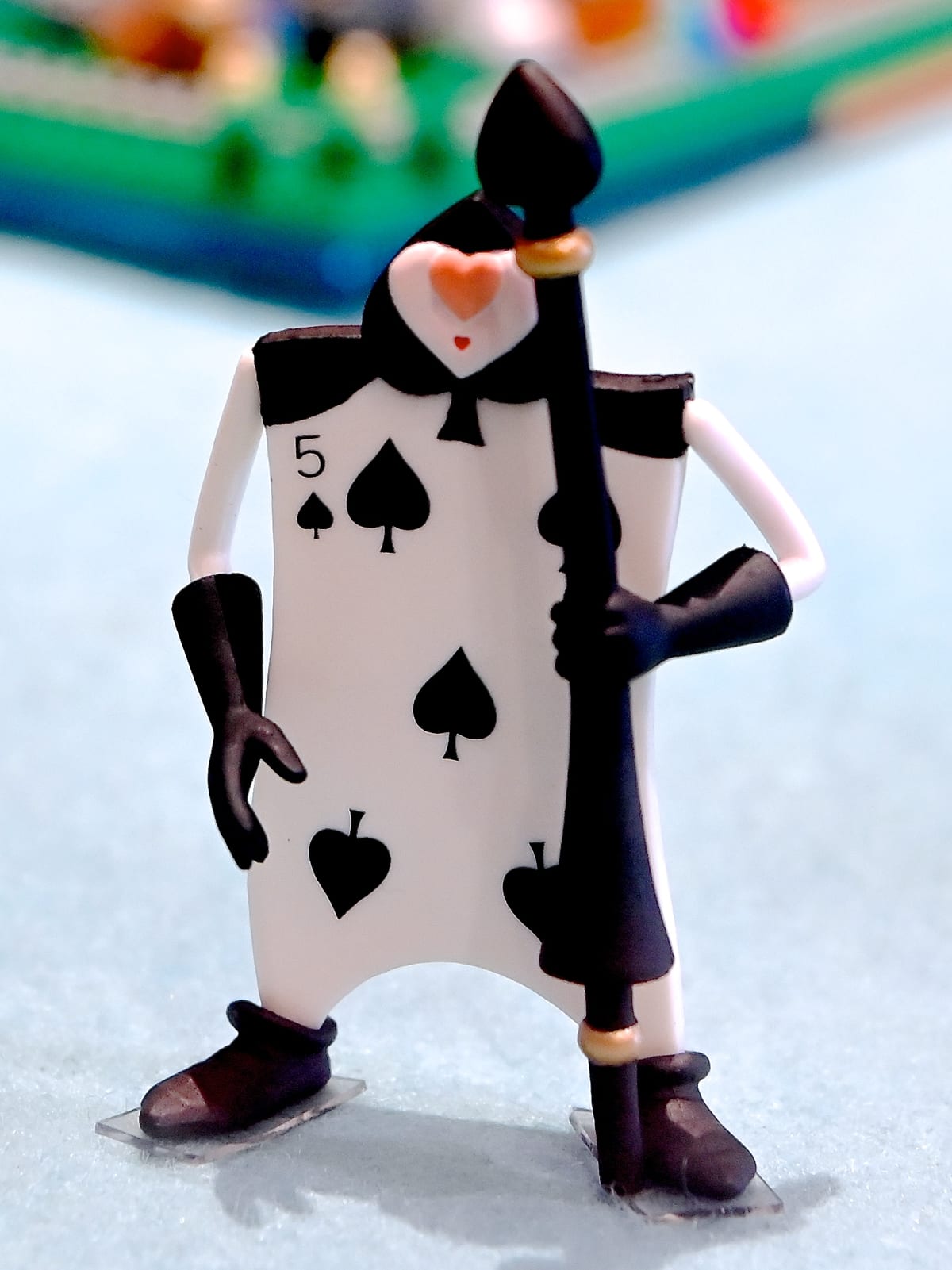 「クイーン・オブ・ハートのバンケットホール」の旗をもったトランプ兵のフィギュア。