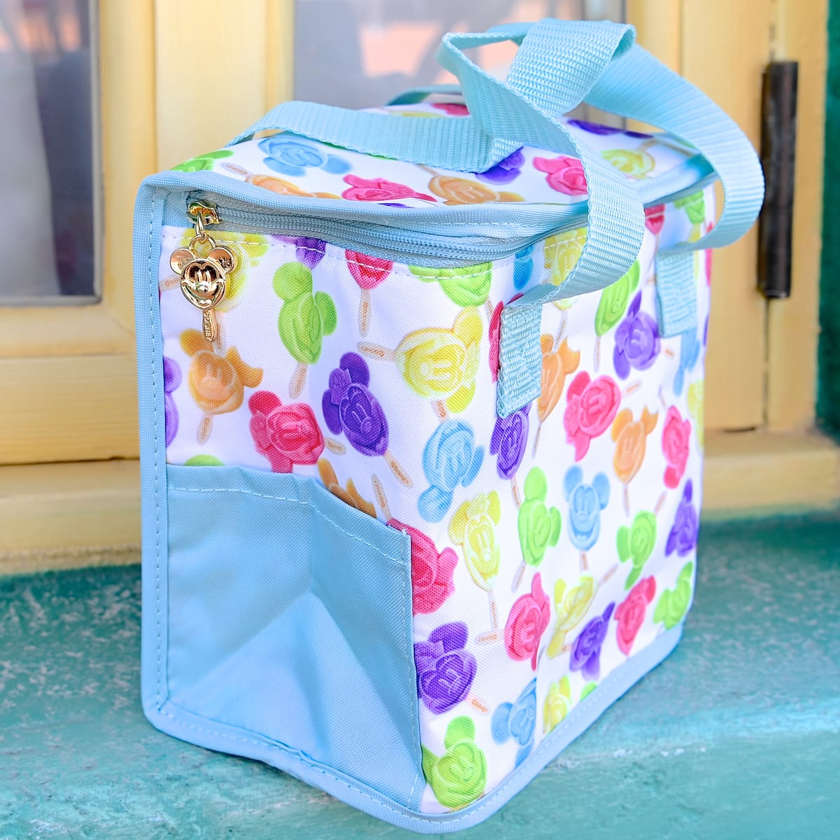 ボックス型のランチケース全体にカラフルなミッキーアイスバー、ミニーアイスバーが総柄でデザインされています。