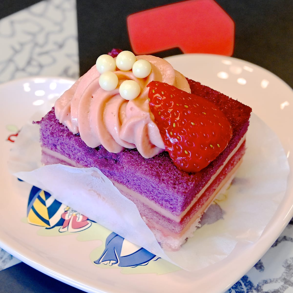 チェシャ猫カラーのすみれ色と紫色が層になったストロベリークリームケーキ。