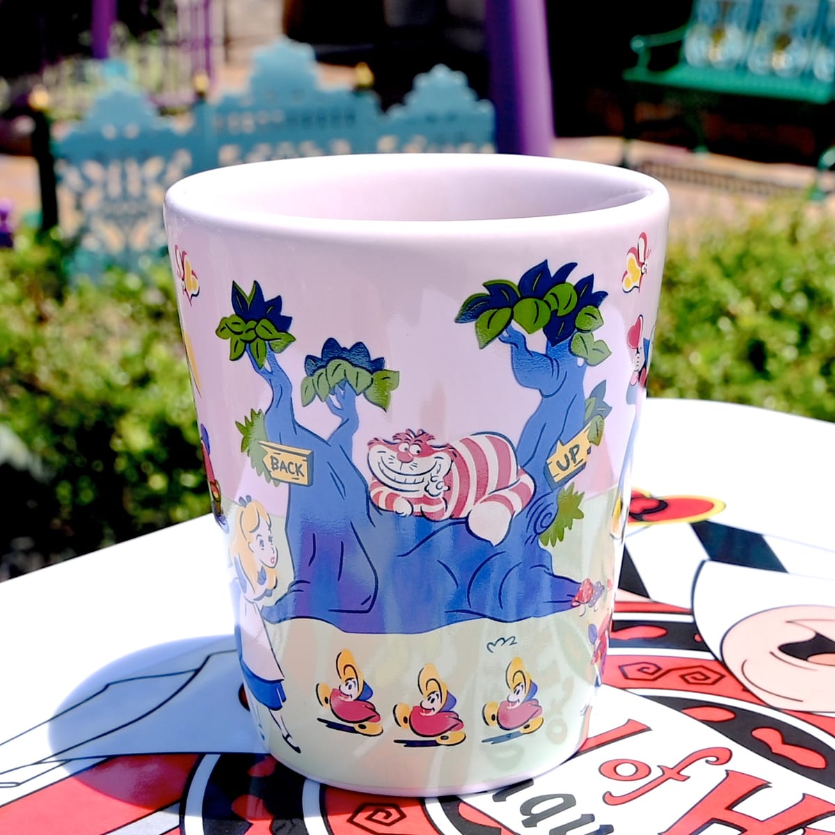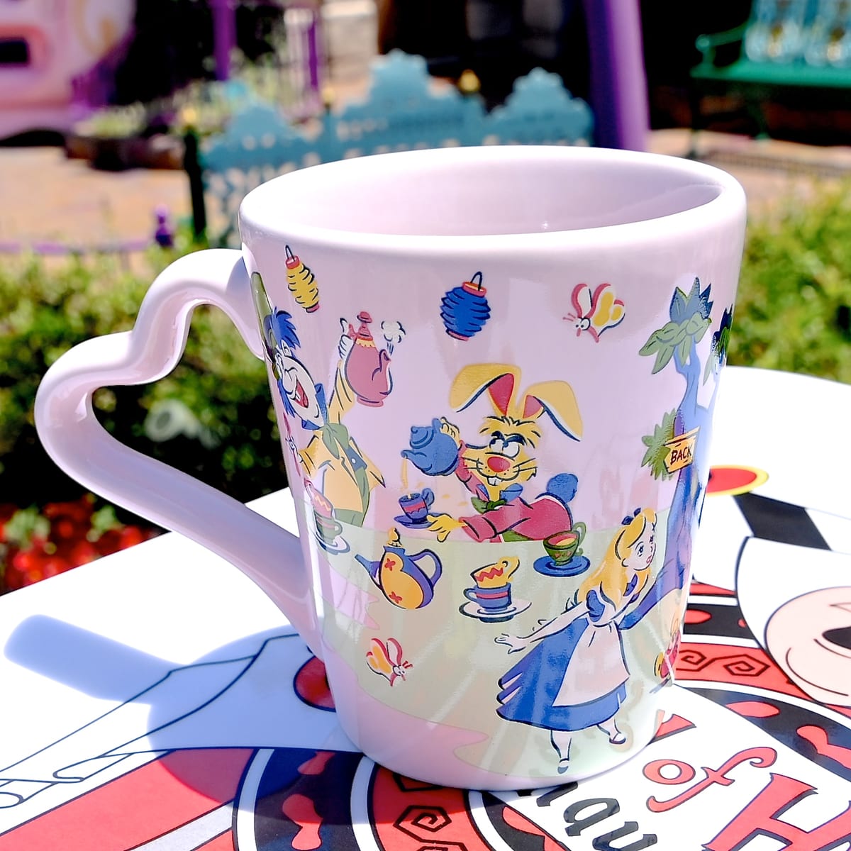 ハートの女王、ハートの王様、ホワイトラビットがデザインされたピンクのスーベニアカップ。