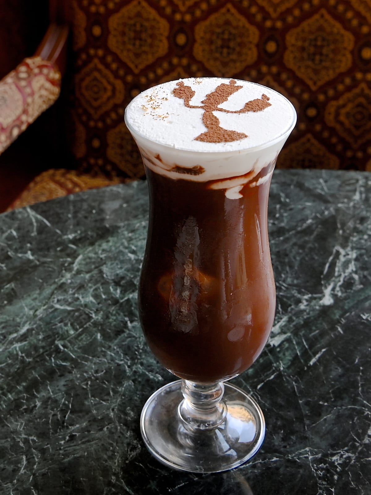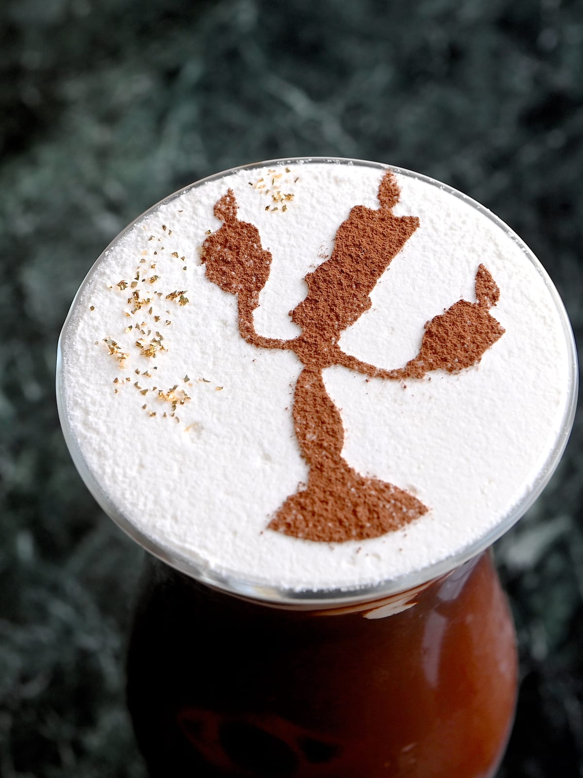 たっぷり入ったクリームに、ポーズをとった「ルミエール」のシルエットがココアパウダーと粉糖、金箔で美しく描かれています。