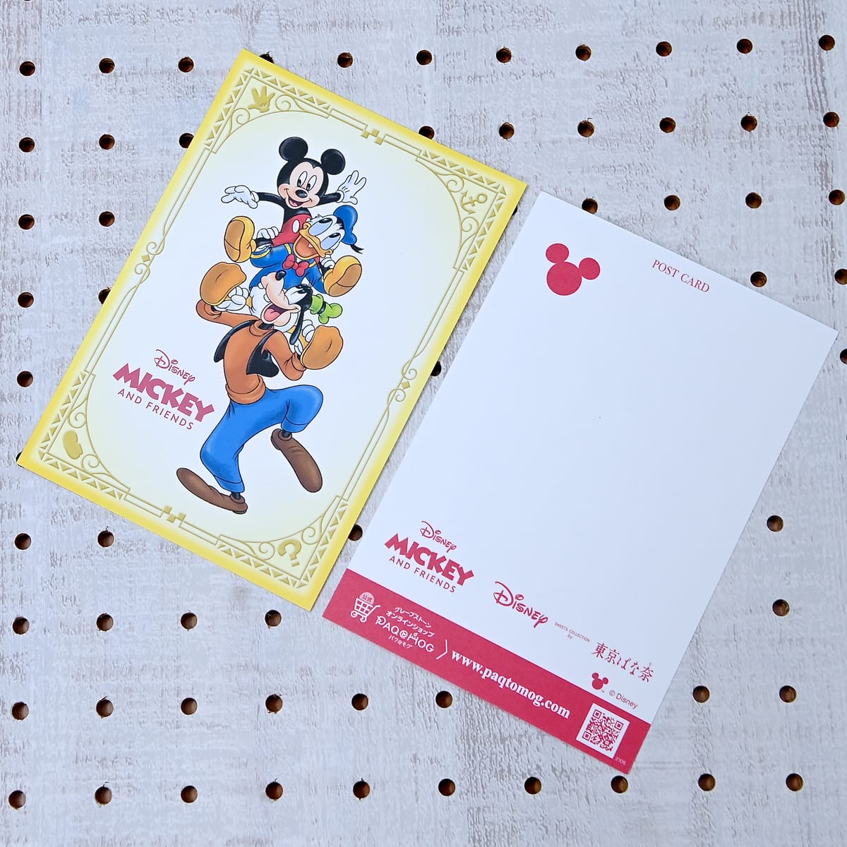 ポストカードの宛名面には「ミッキー&フレンズ」のロゴの他、グレープストーンオンラインショップ「パクとモグ」のURLとQRコードがかかれています。