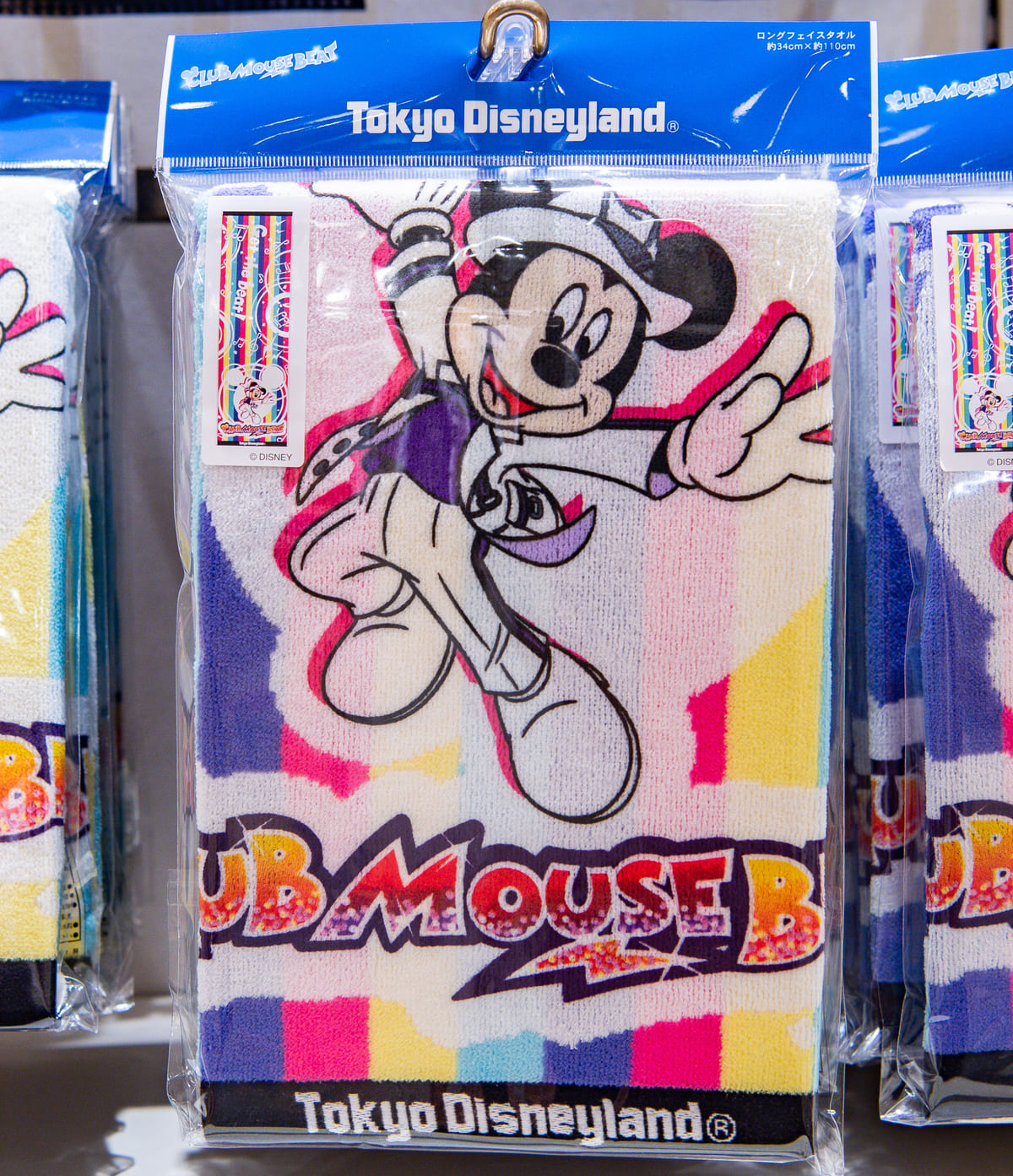 ビートがミッキーシェイプでデザインされたカラフルなロングフェイスタオル。