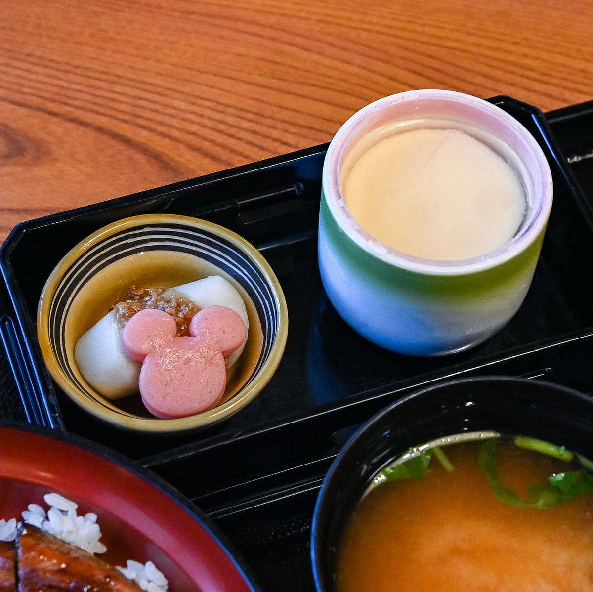 ミッキーシェイプのかまぼこ&里芋、茶碗蒸しもセットになっています。