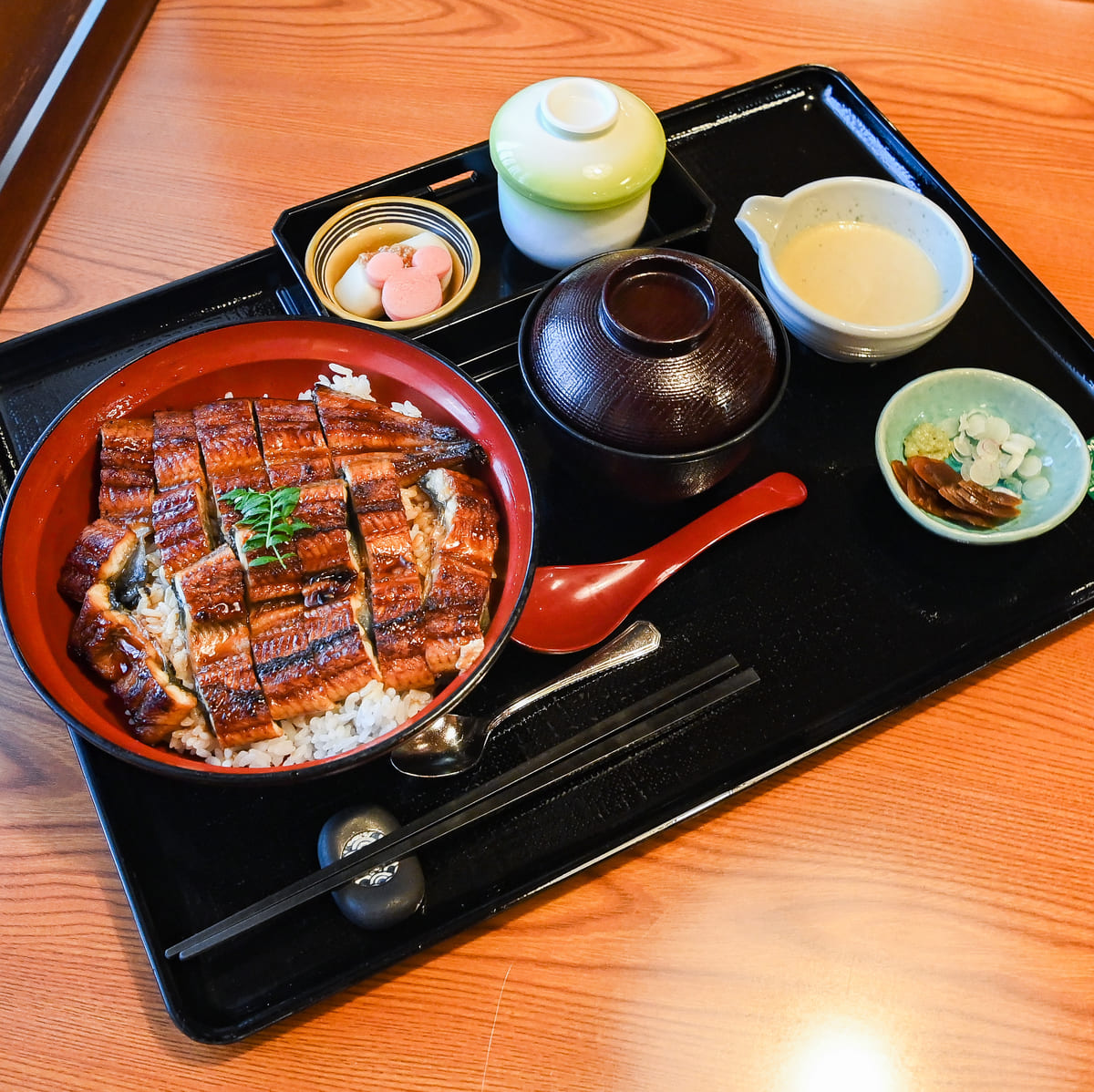 鰻丼、とろろ、小鉢、茶碗蒸し、味噌汁、香の物