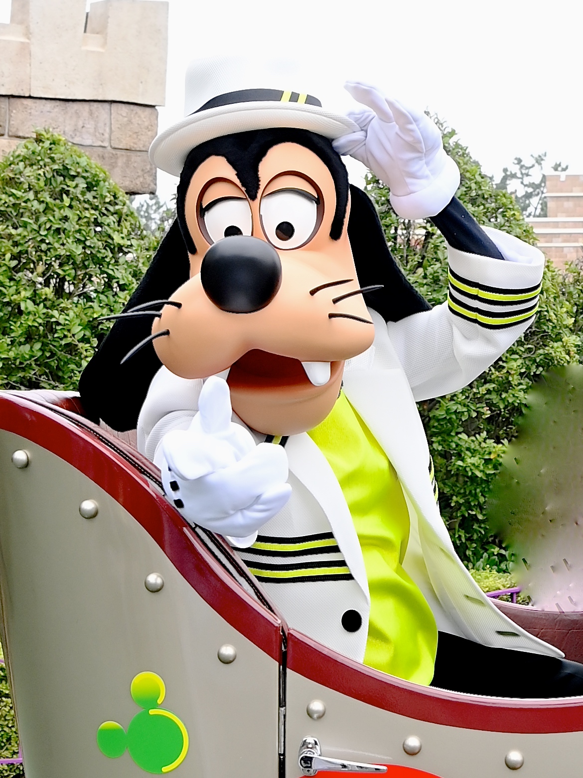 ホワイトにイエローのラインが華やかなコスチューム姿のグーフィー。