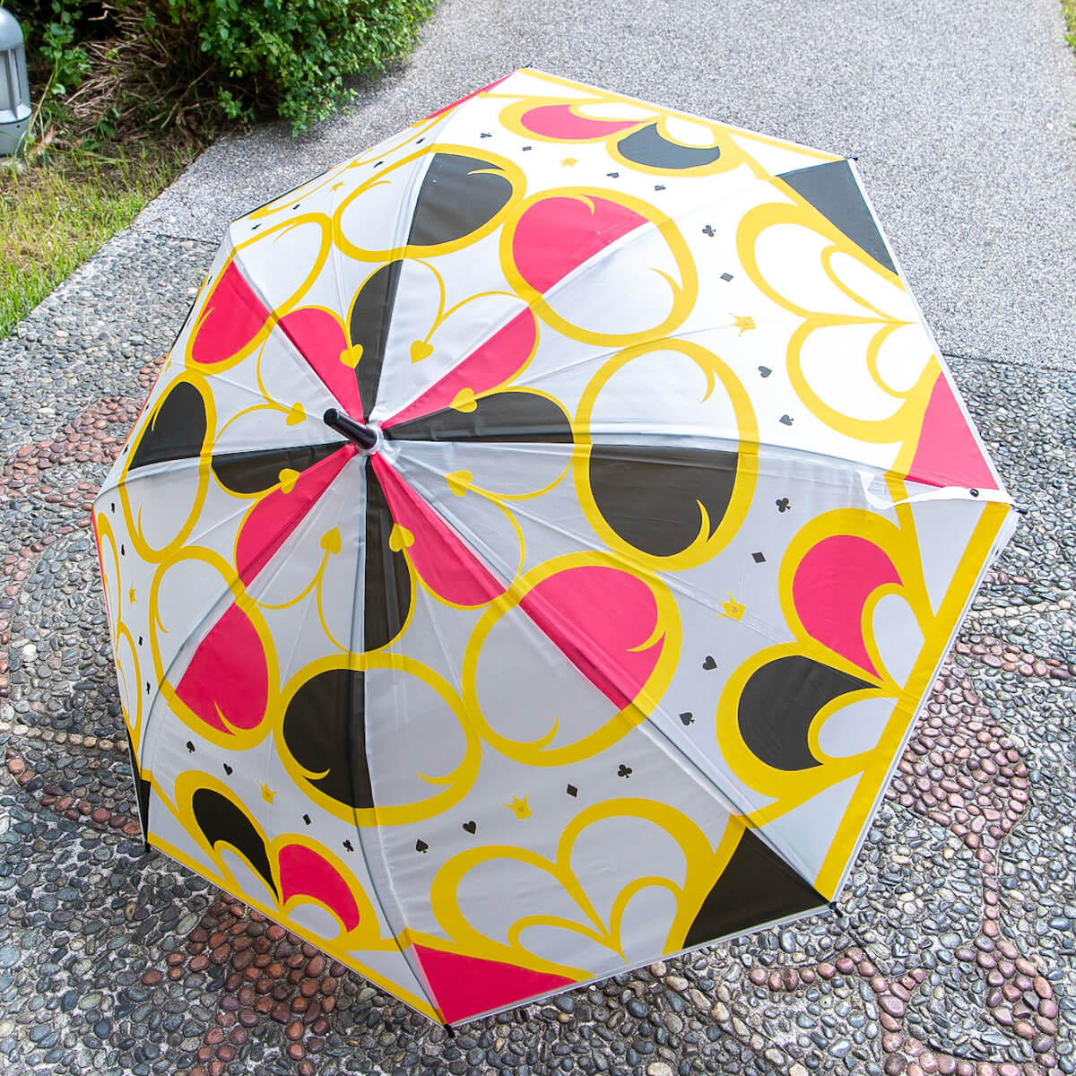トランプのスートを取り入れた、赤・黒・黄のビニール傘です。