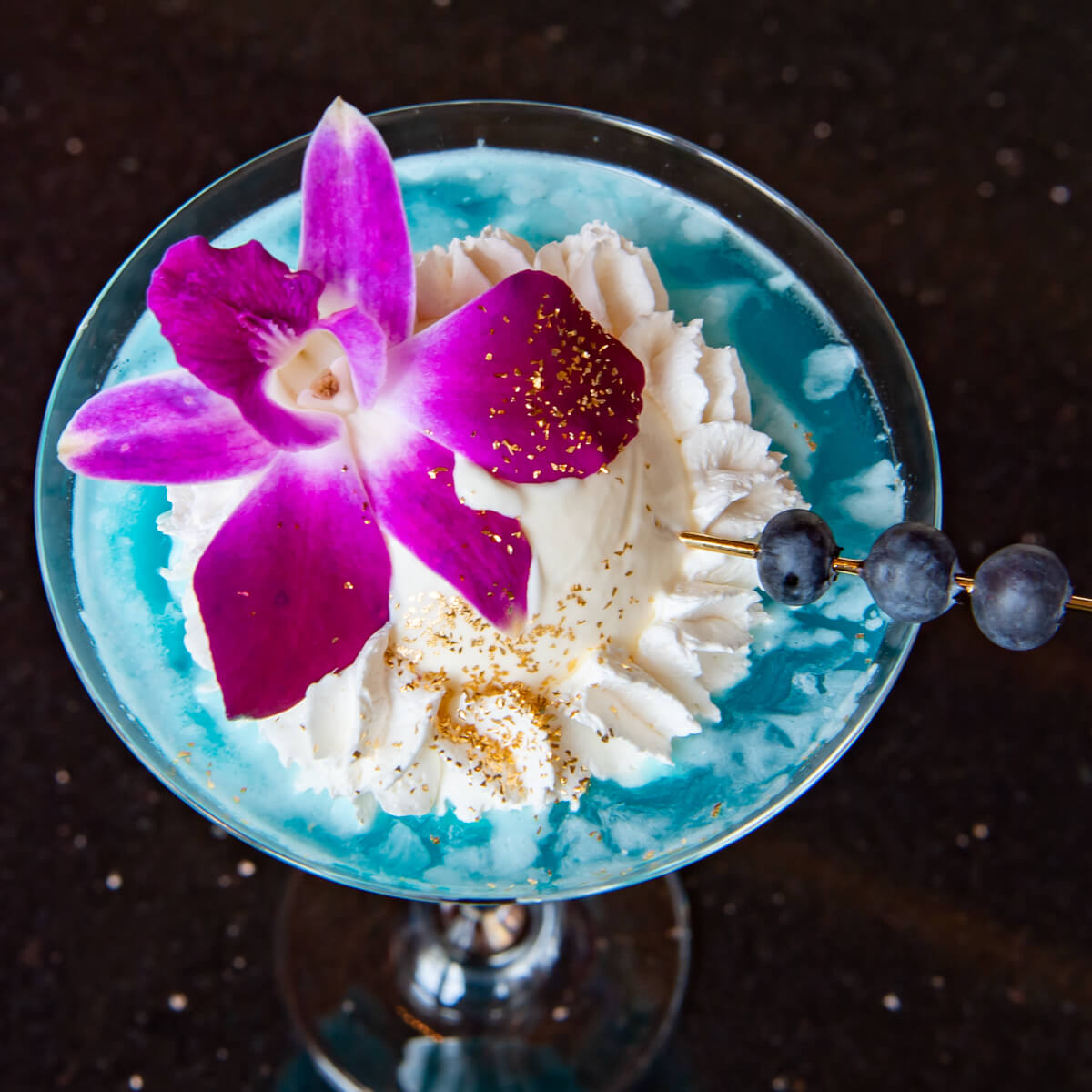 パイナップルジュース、カルピス、ブルーシロップ、パッションフルーツシロップの爽やかにいただけるフローズンドリンクにバニラアイスクリーム、ホイップクリーム、デンファレ、金箔、ブルーベリーをトッピング☆