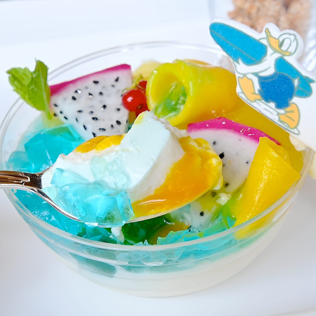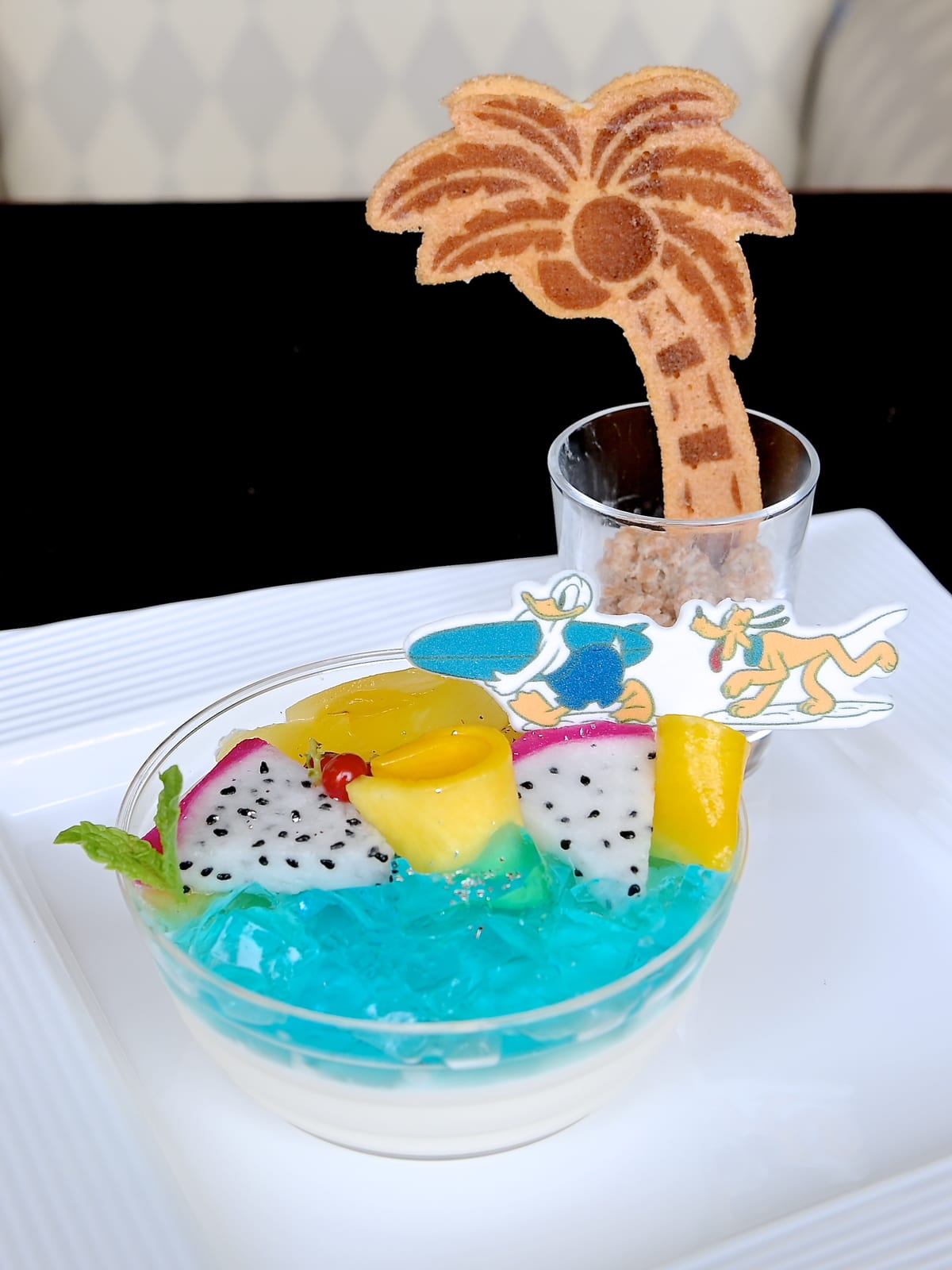 ぷるぷるで濃厚なココナッツのブランマンジェの上には、水面をイメージしたさっぱり爽やかなブルーのゼリー、マンゴー、ドラゴンフルーツがトッピングされています☆