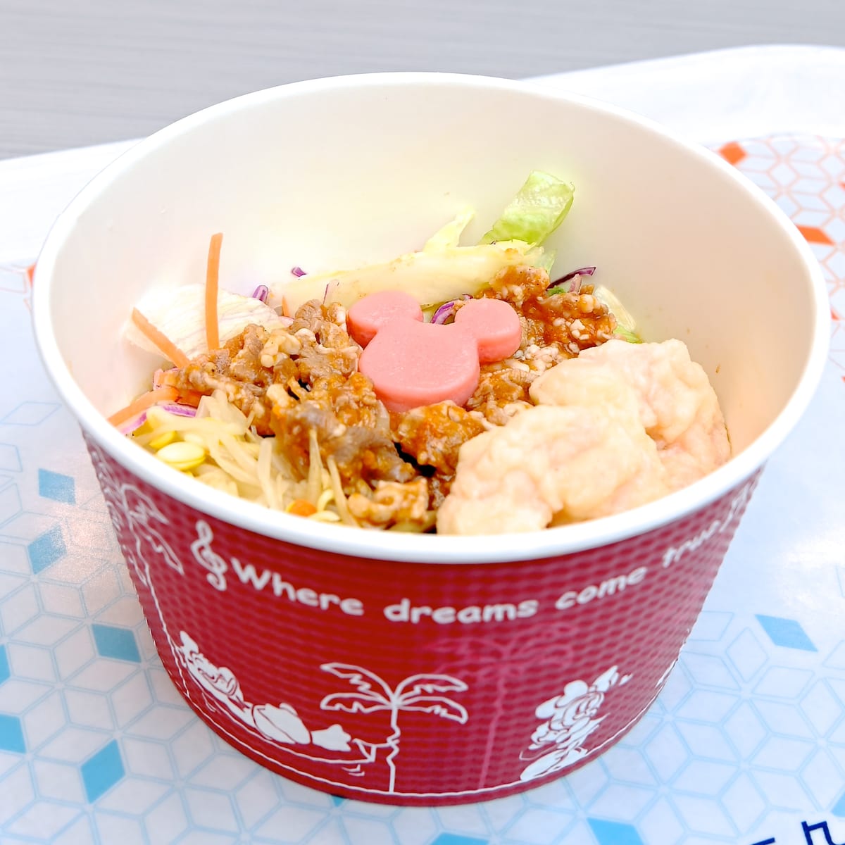 2021年夏は、牛カルビ、エビフリット、ミッキーシェイプのかまぼこ、ナムル、シャキシャキのサラダがトッピングされた具沢山なメニュー!