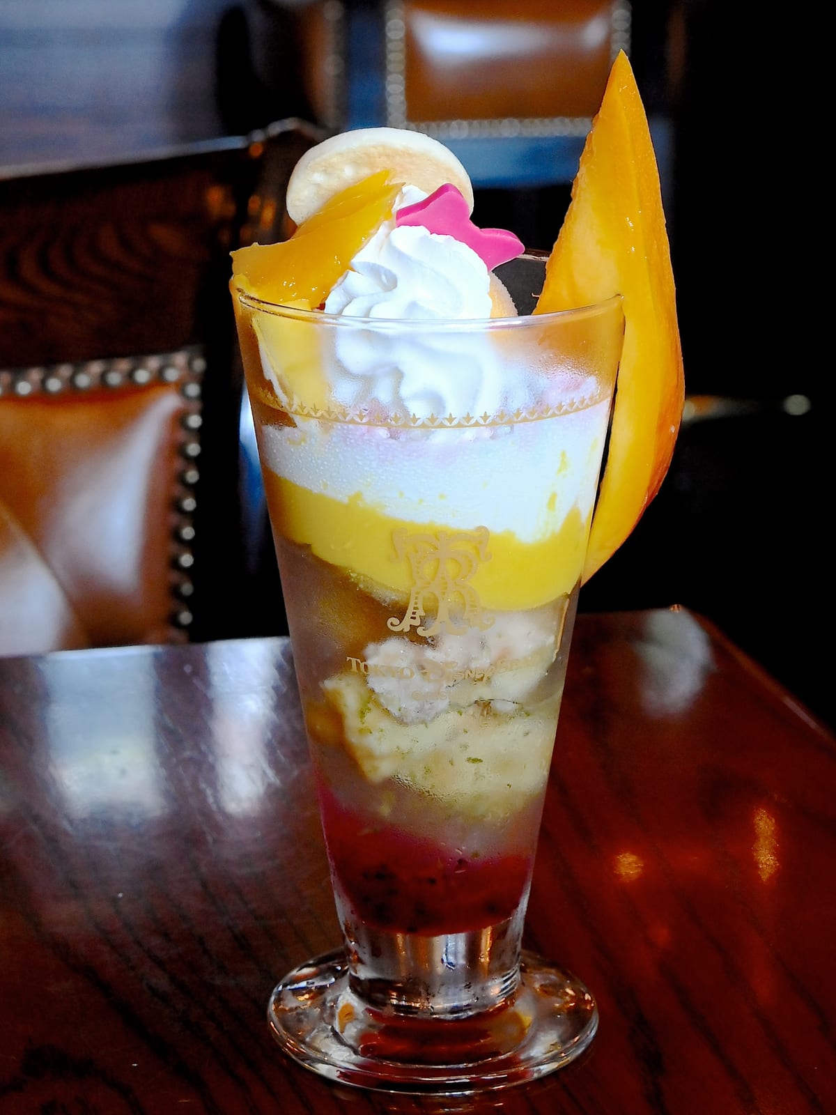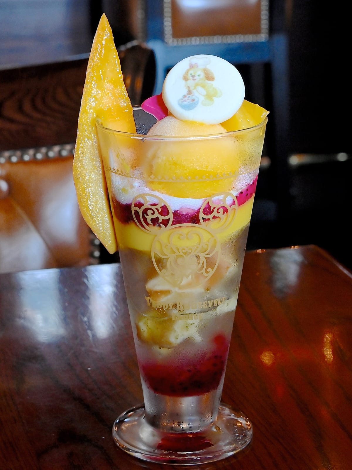 「クッキー・アン」カラーのトロピカルなマンゴーを使ったパフェ。