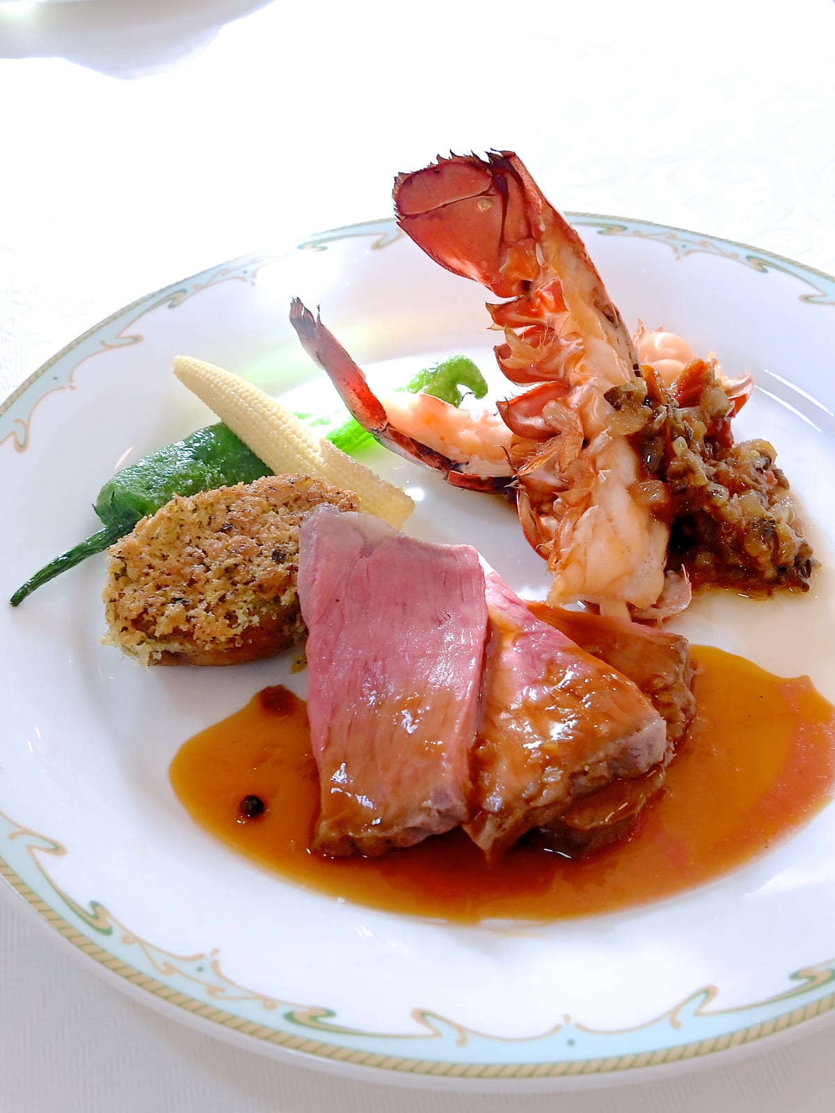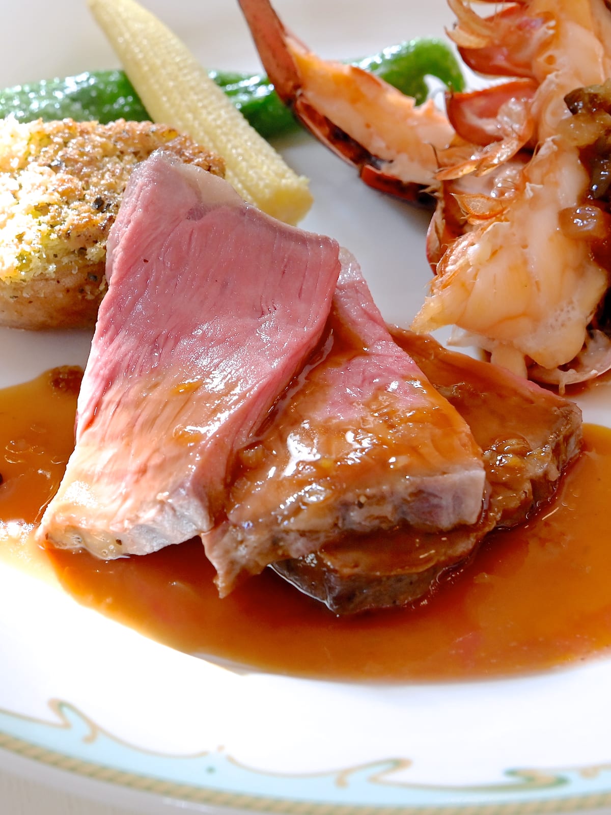 ローストビーフとオマール海老のオーブン焼き、グリーンペッパーソースとラヴィゴットソース