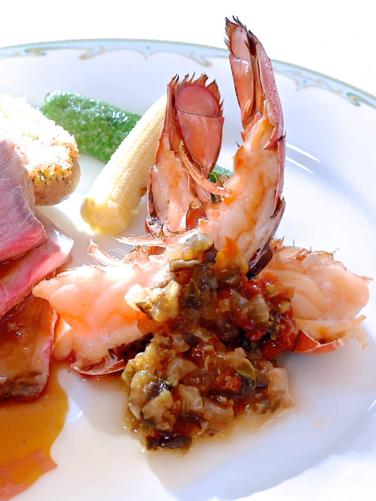 オマール海老のオーブン焼きは、塩味と酸味の効いた、ピクルスなどの野菜のみじん切り、ラヴィゴットソースでいただきます。