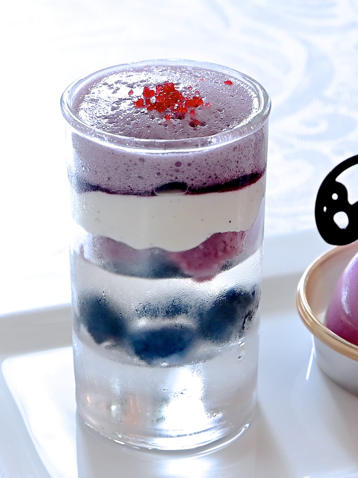 下からブルーベリーとアニスのゼリー、スポンジ、バニラマスカルポーネクリーム、ブルーベリーソース、ベリーのピューレを泡立てたもの、ラズベリーの顆粒が層になったオシャレなグラスデザートと、