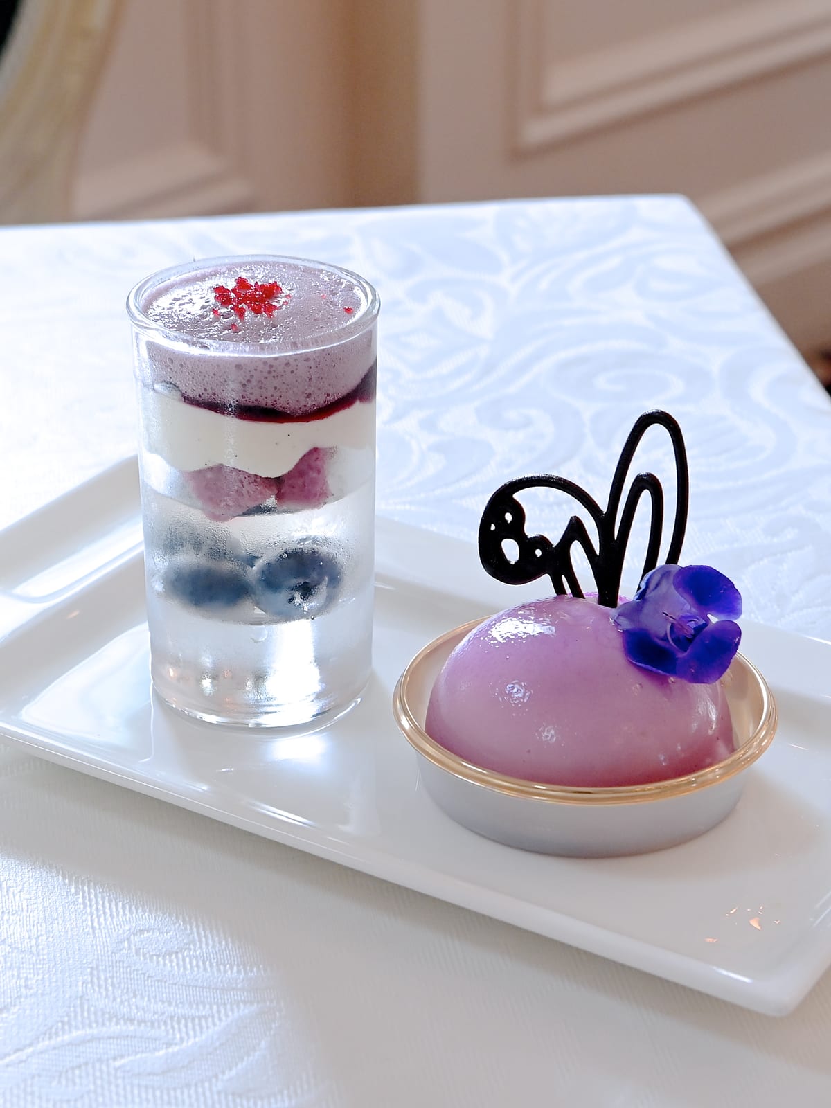 デザートは、「ステラ・ルー」をイメージしたブルーベリーヴェリーヌとすみれ風味のフロマージュムースケーキ。