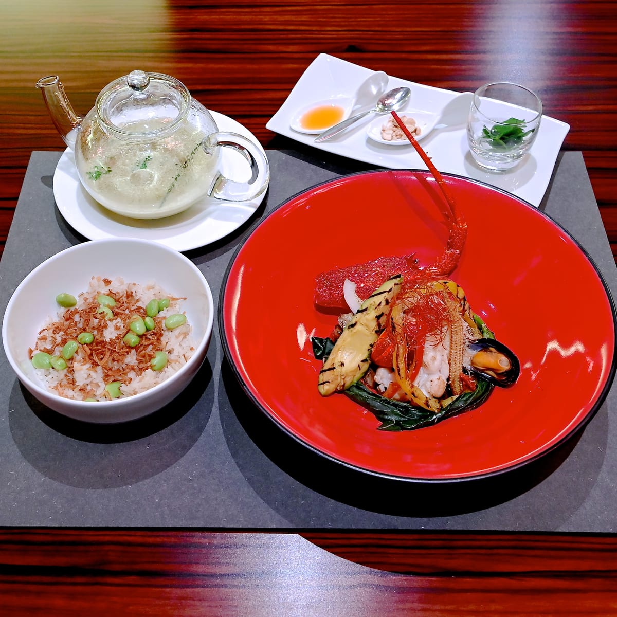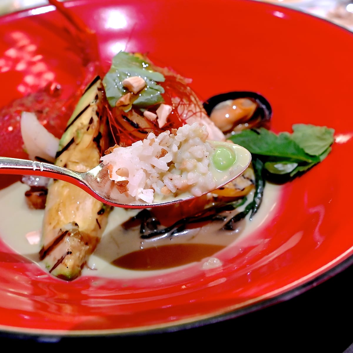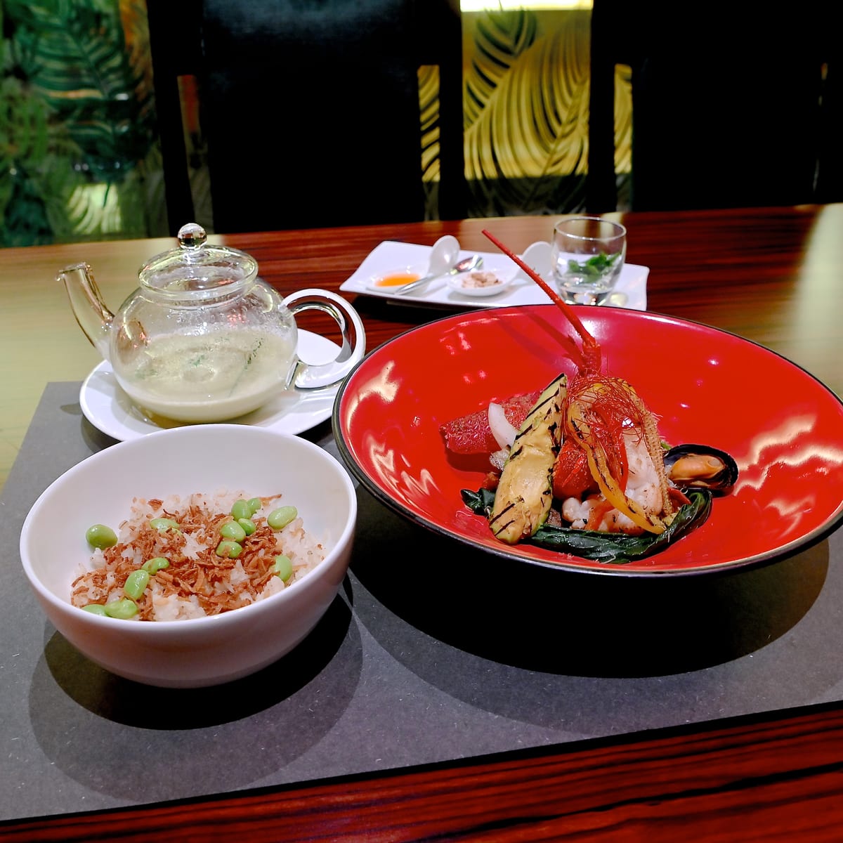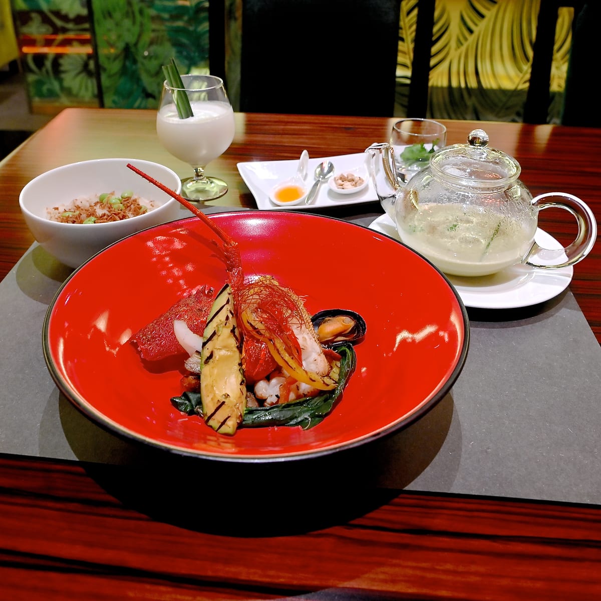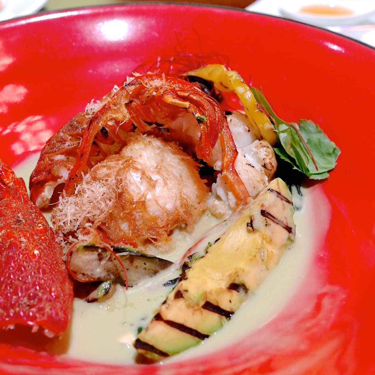 - 鰹だし香るイセエビと彩り野菜のグリーンカリーフライドエッグ添え カフィアライムのアクセント