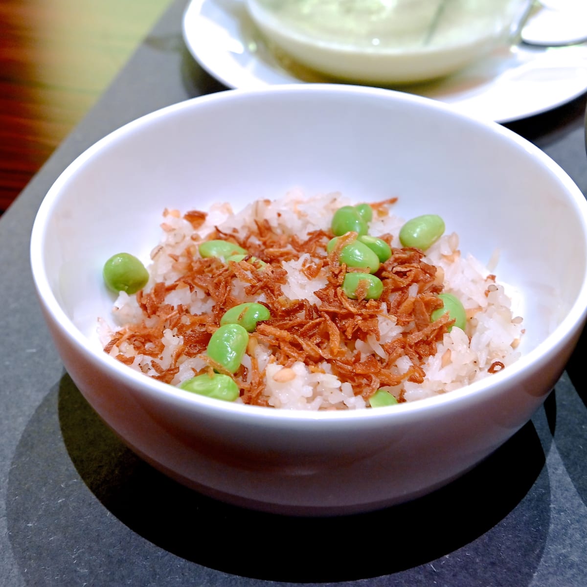 ジャスミンライスには、フライドオニオンと枝豆がトッピングされています。