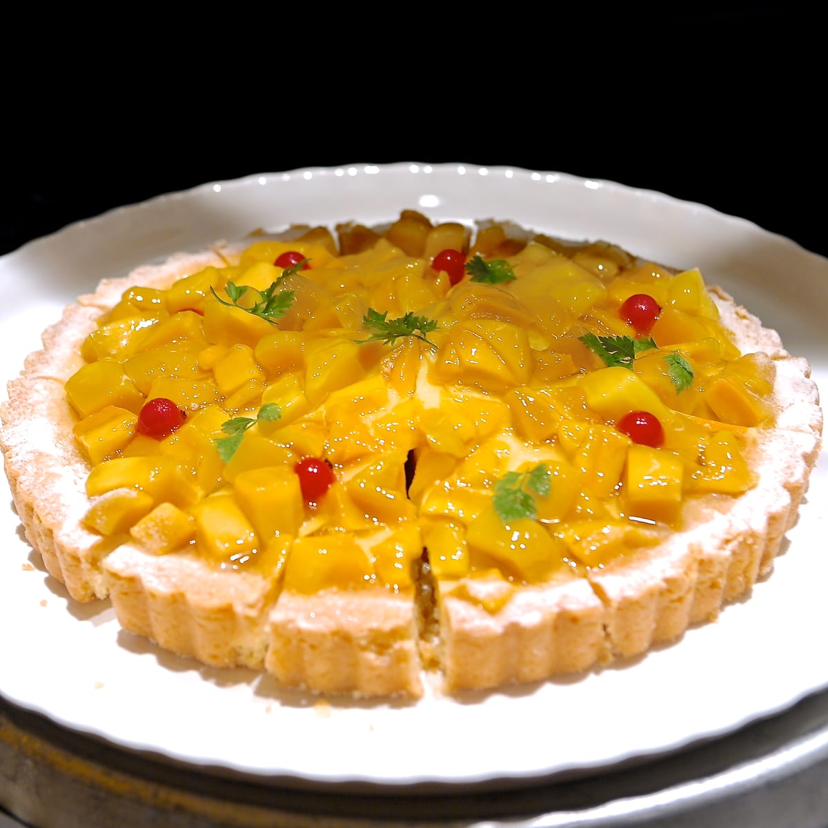 マンゴーがたっぷりトッピングされた色あざやかなタルト。