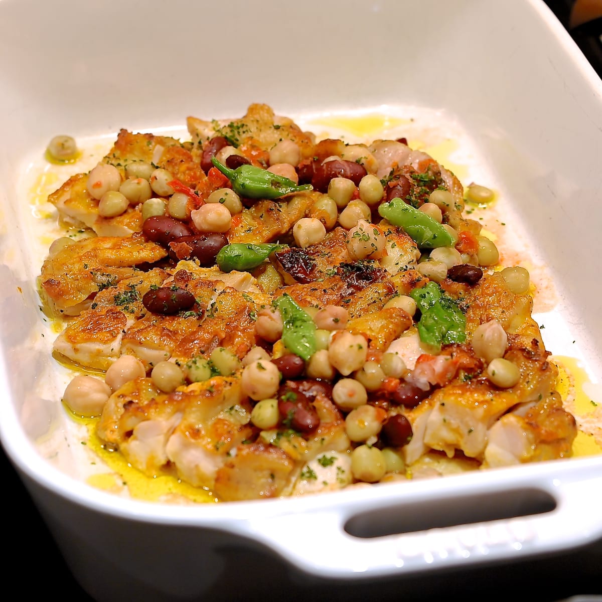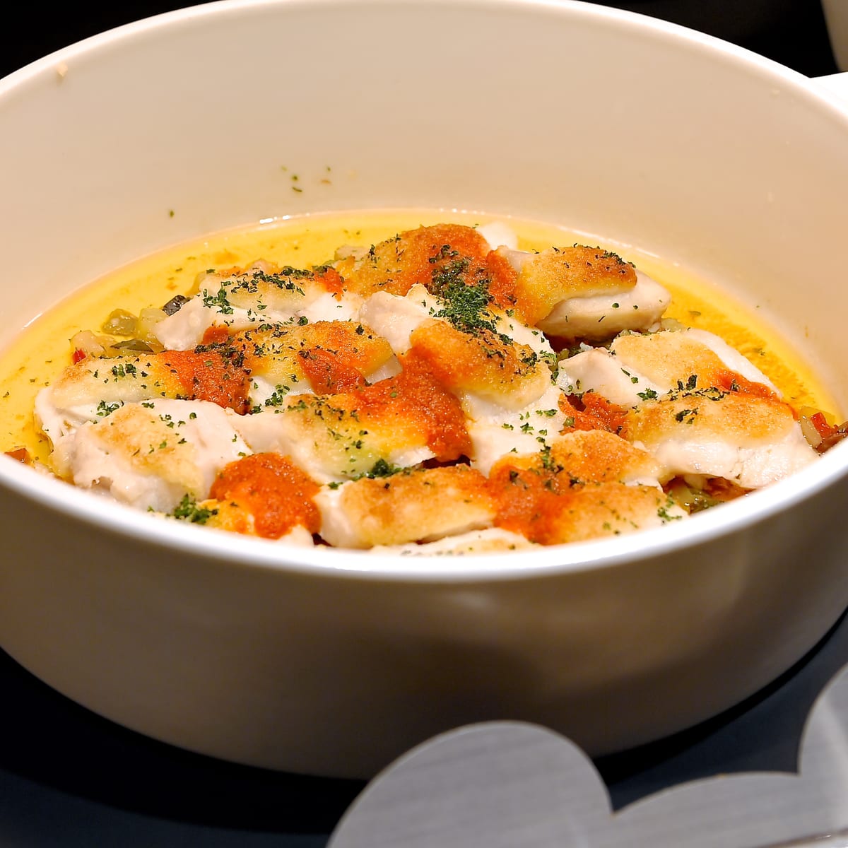 チーズのパン粉焼きがトッピングされた白身魚のロースト。