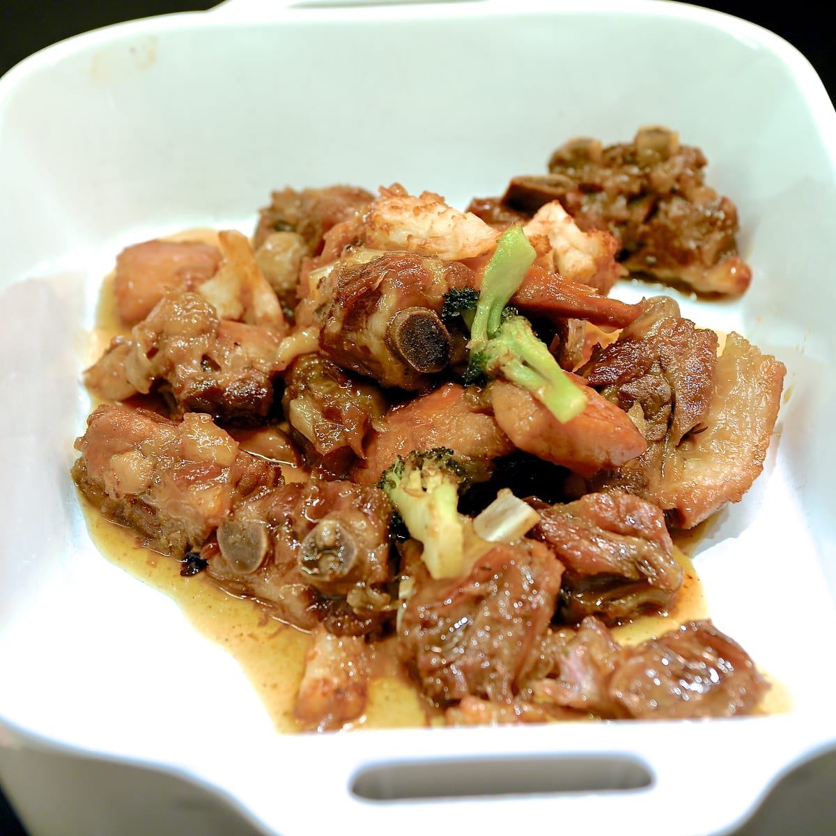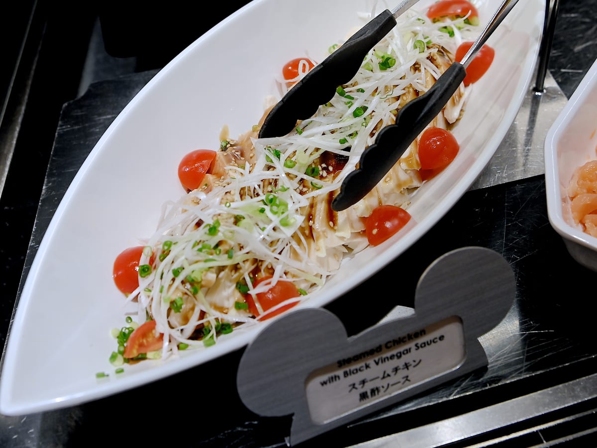 食欲がそそられる黒酢ソースがけのスチームチキン。