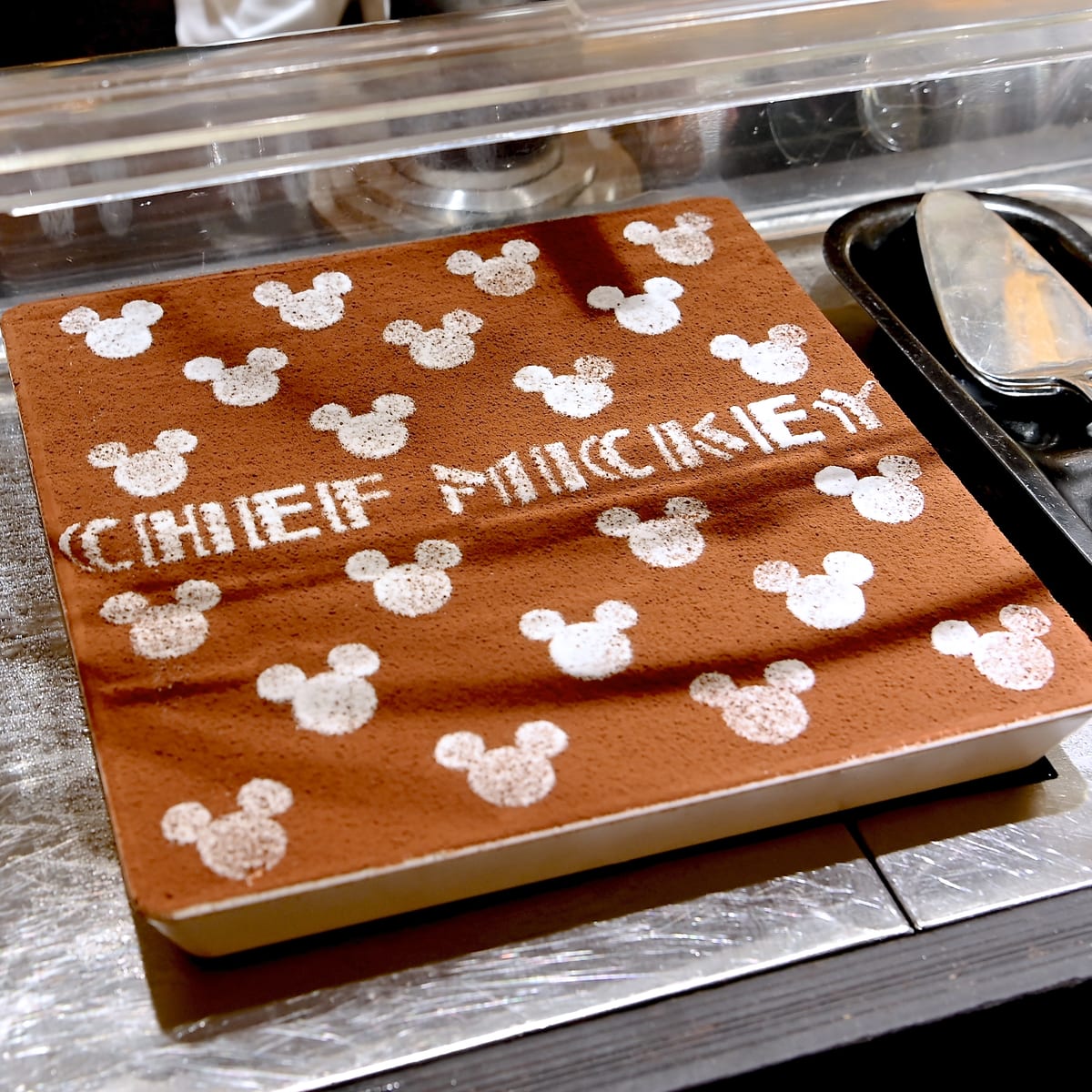 「シェフ・ミッキー」のロゴ、ミッキーマークがデザインされたティラミス。