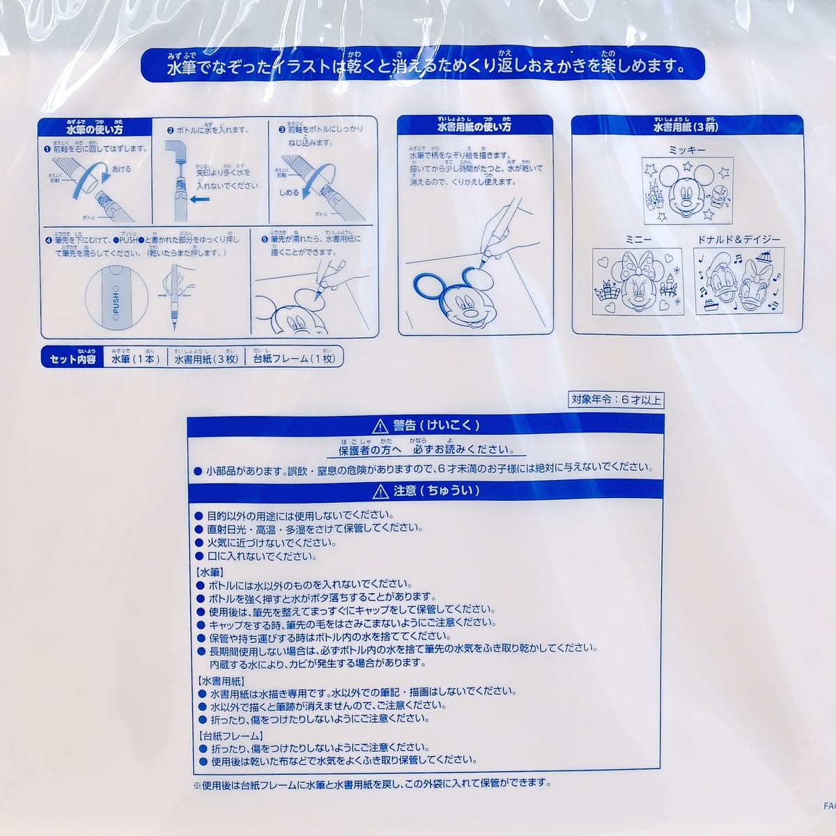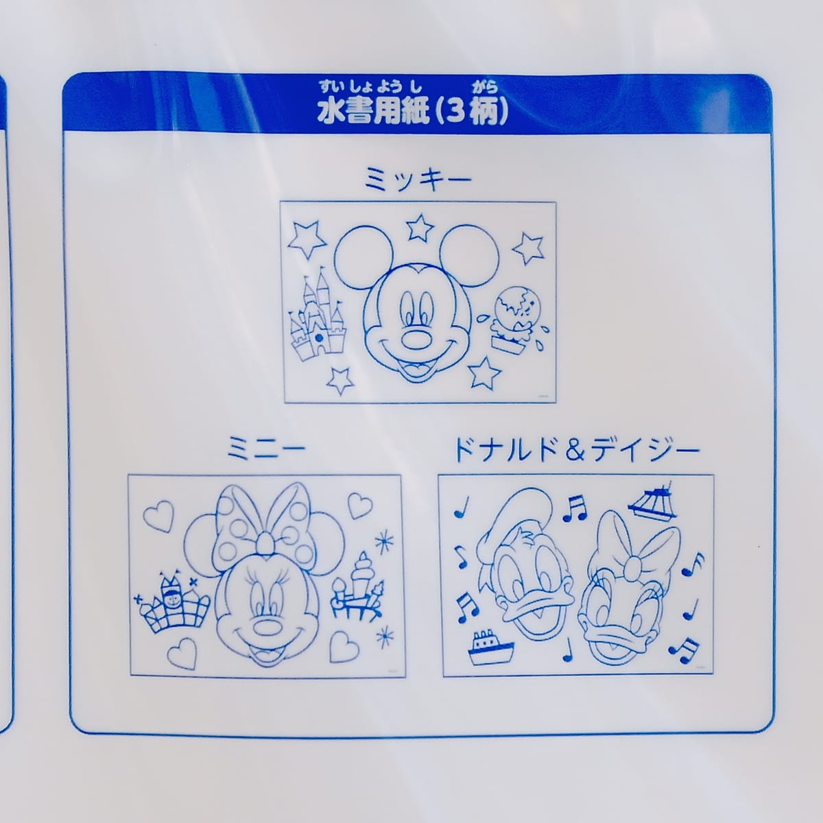 ミッキーマウス、ミニーマウス、ドナルドダック&デイジーダックの水書用紙が3枚セットになっています。