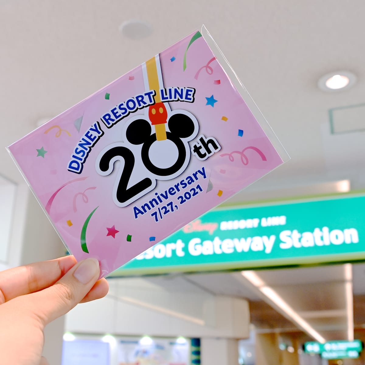 JR舞浜駅に隣接するリゾートゲートウェイ・ステーションでは、20周年を記念したデザインのフリーきっぷが特別な台紙付きで登場!
