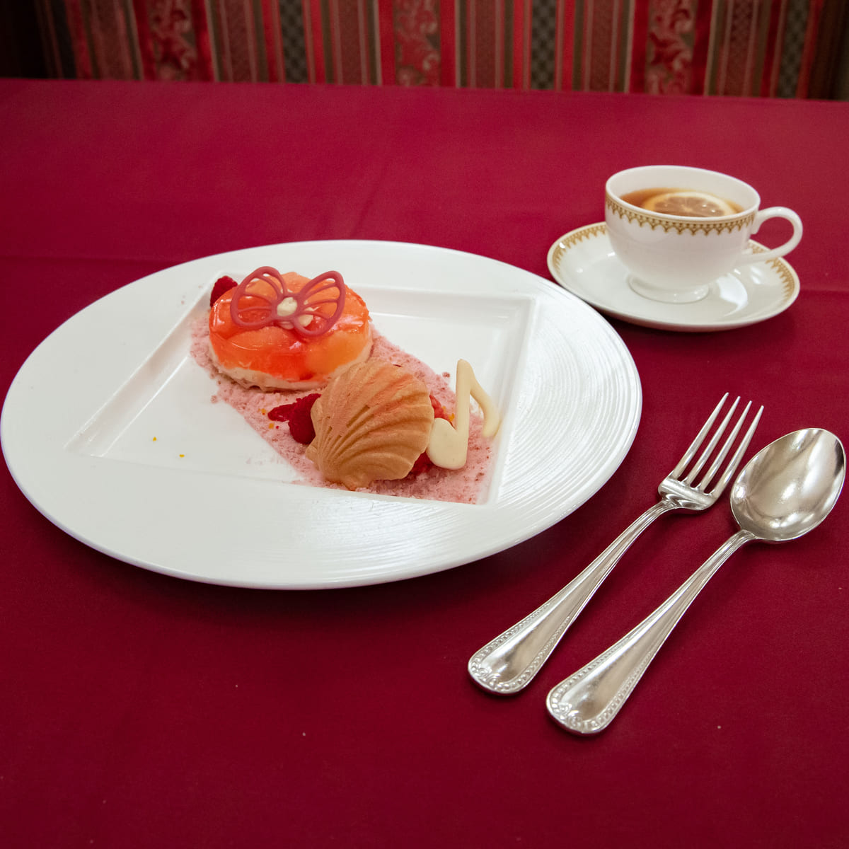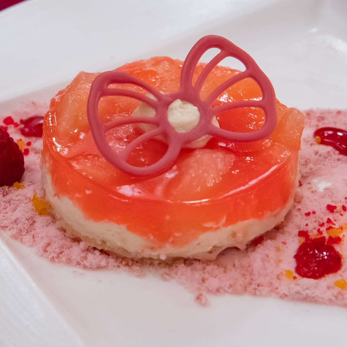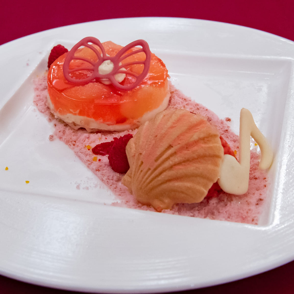 ピーチマリネ、ジャスミンクリームパイ、ラズベリーソルベ