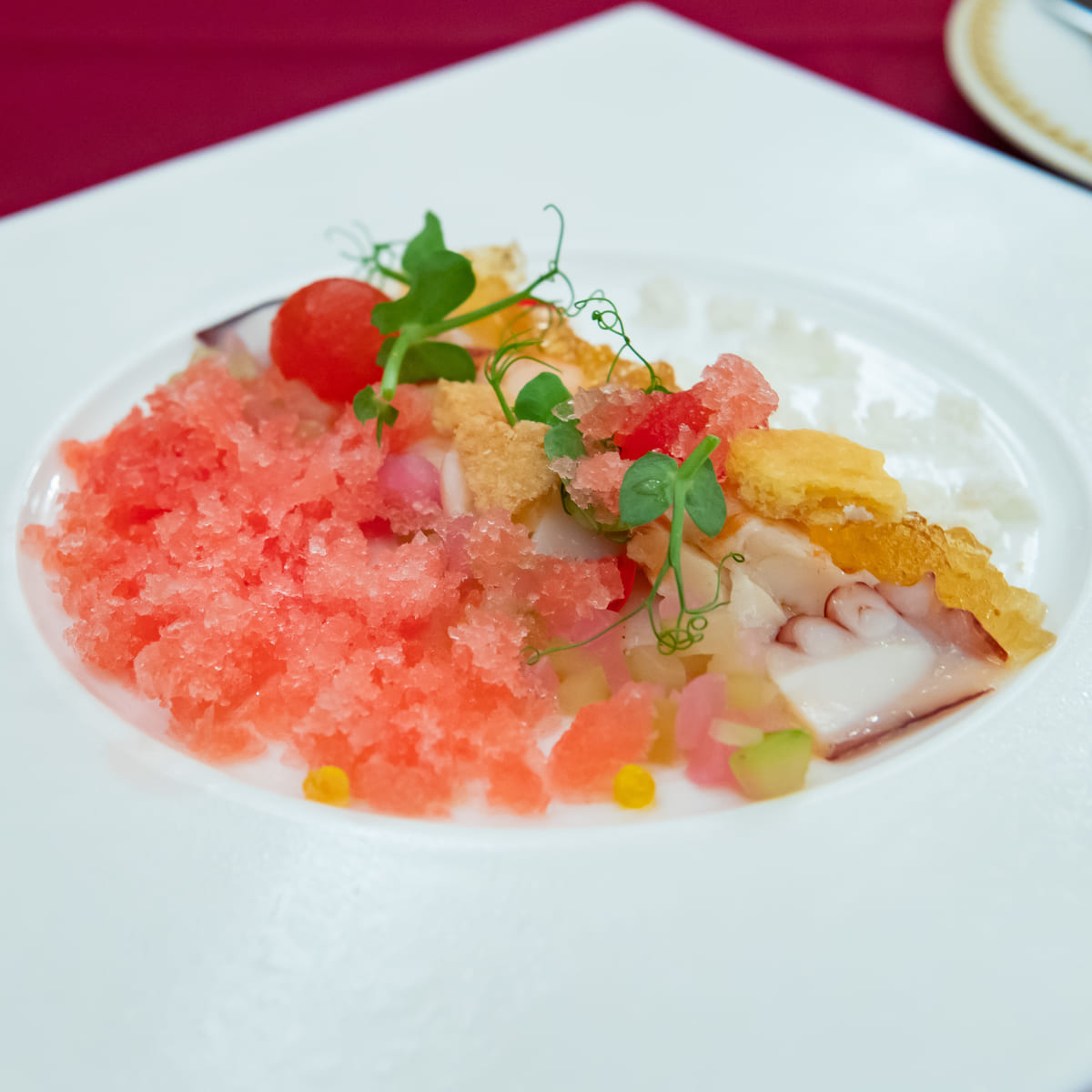 シーフードのオレンジマリネ、スイカのグラニテと共に