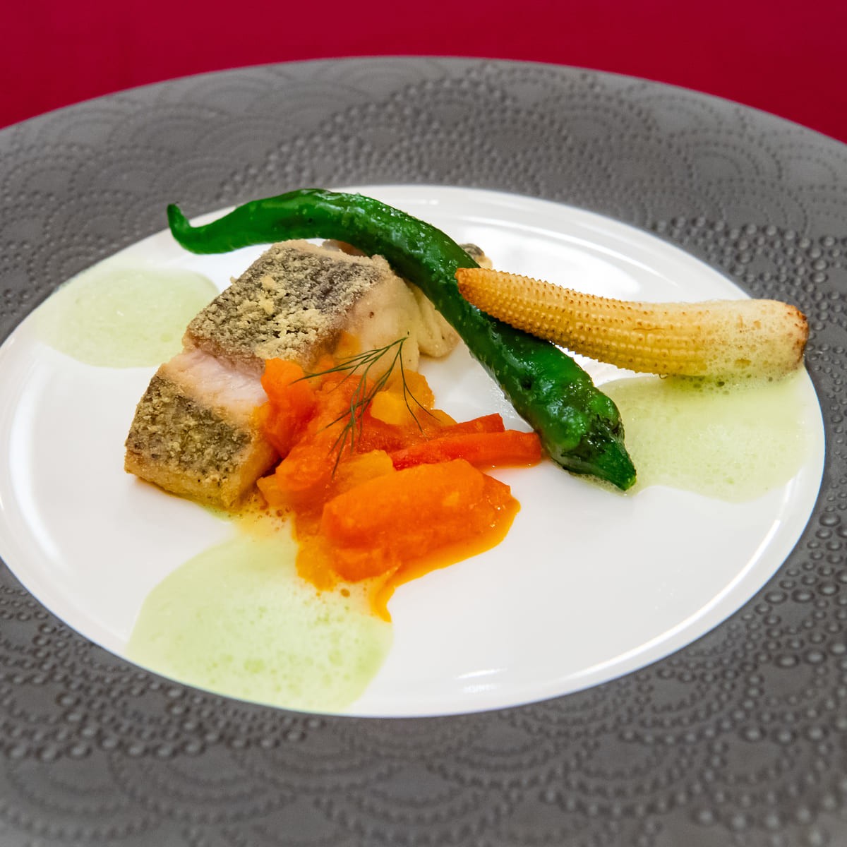 コーングリッツをまとったアオダイのポワレ、ピペラードとフヌイユのフォーム