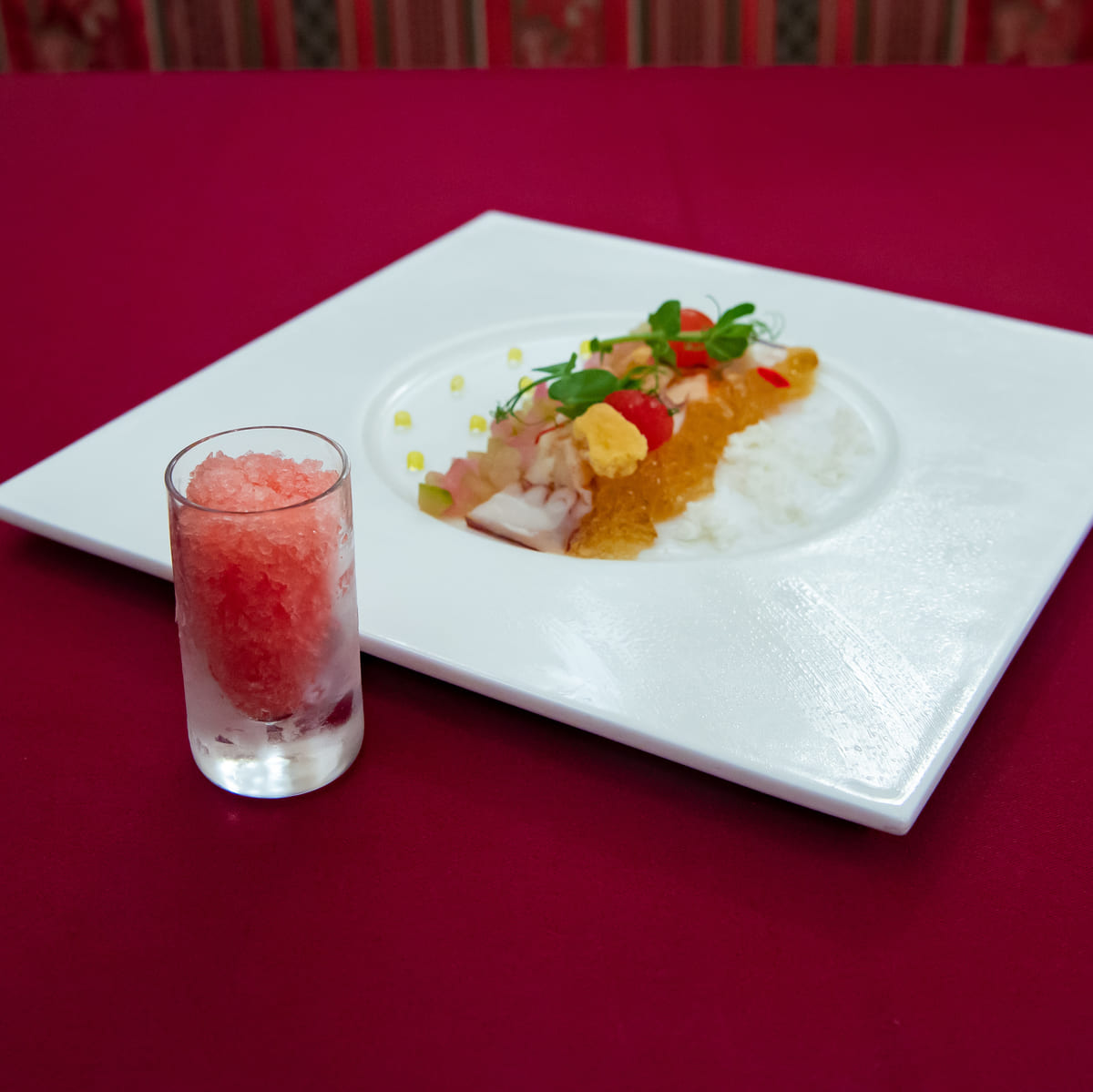 ・シーフードのオレンジマリネ、スイカのグラニテと共に