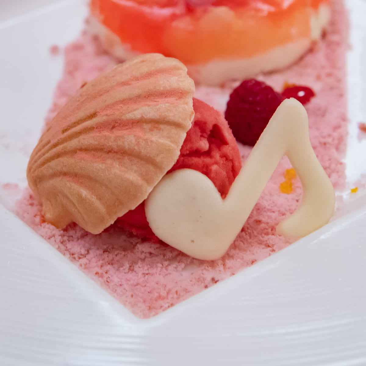 貝殻のモナカの下には、ラズベリーシャーベット。