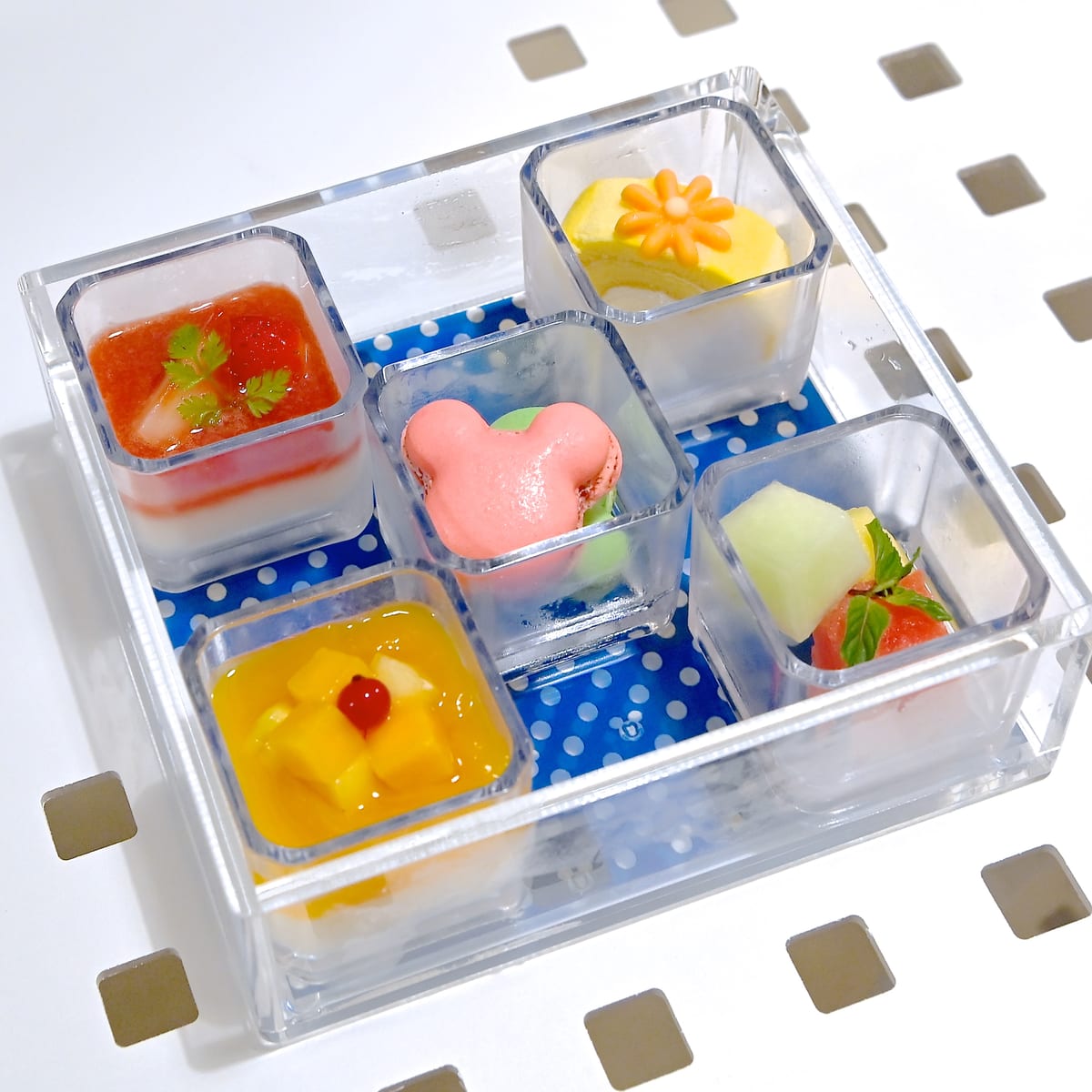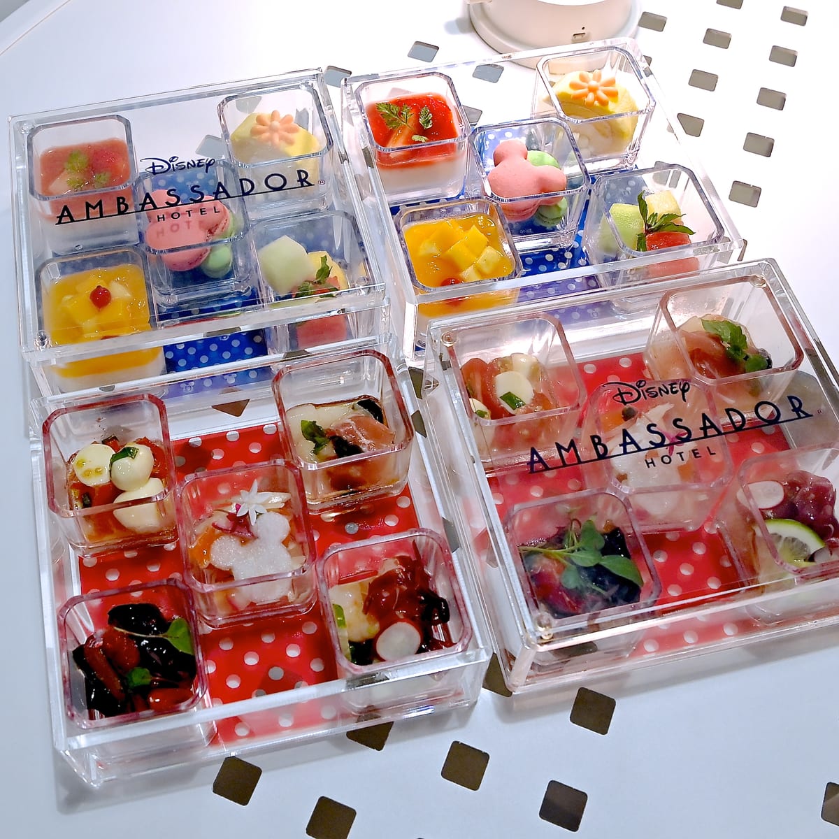 デザートは、ミッキーマカロン、パンナコッタとラズベリースープ、フルーツ(パイナップル・スイカ・メロン)、日向夏ロールケーキ。