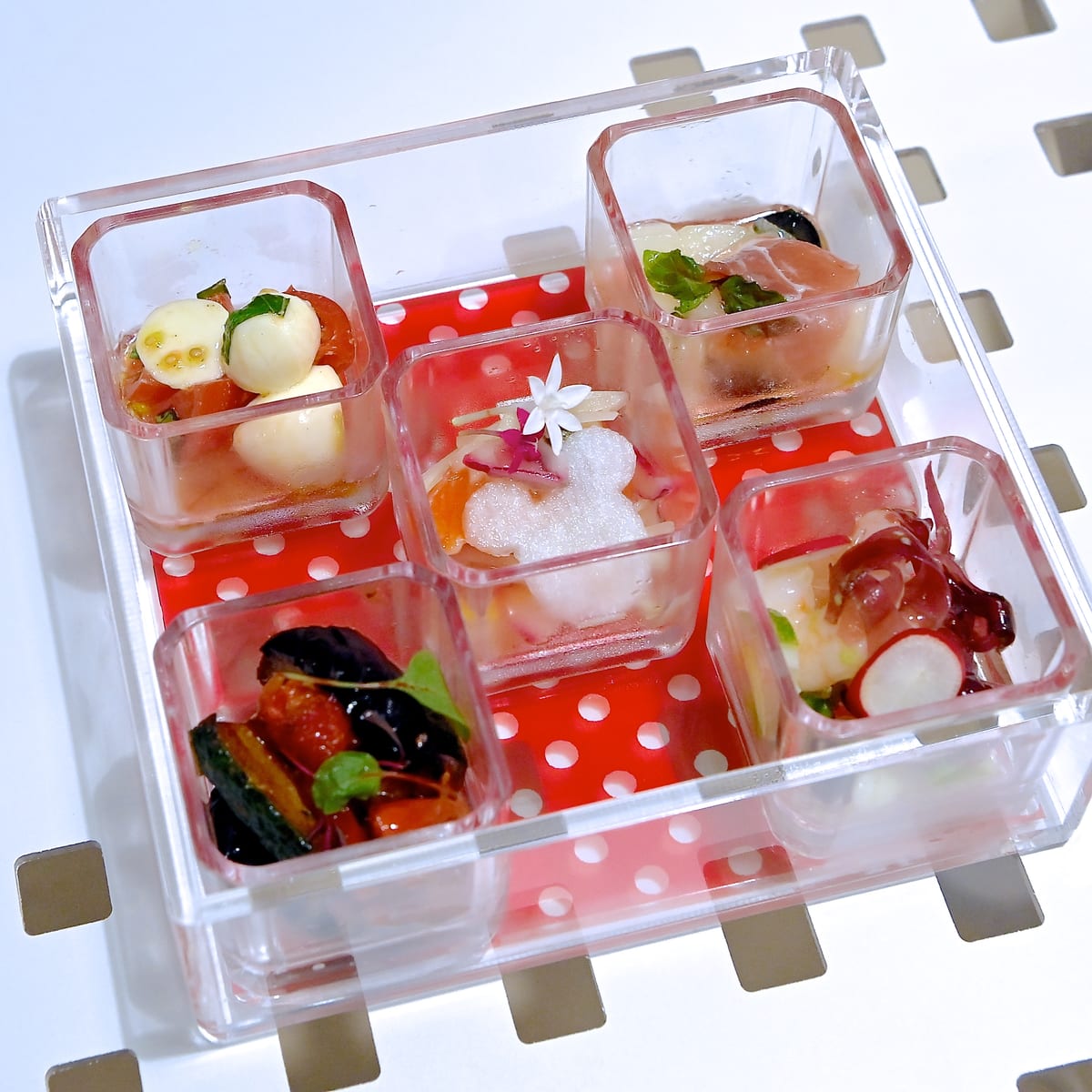 前菜は、桃とプロシュートのオリーブ添え、カプレーゼ、茄子とズッキーニのカリー風味、スモークサーモンとパパイヤのサラダ、タコのマリネ。