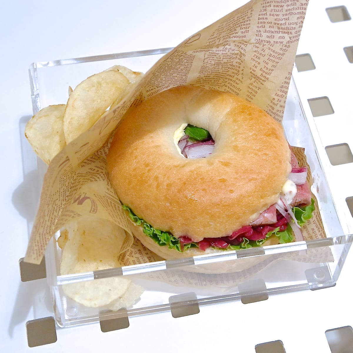 サンドウィッチは、ローストビーフとレッドキャベツのベーグル。