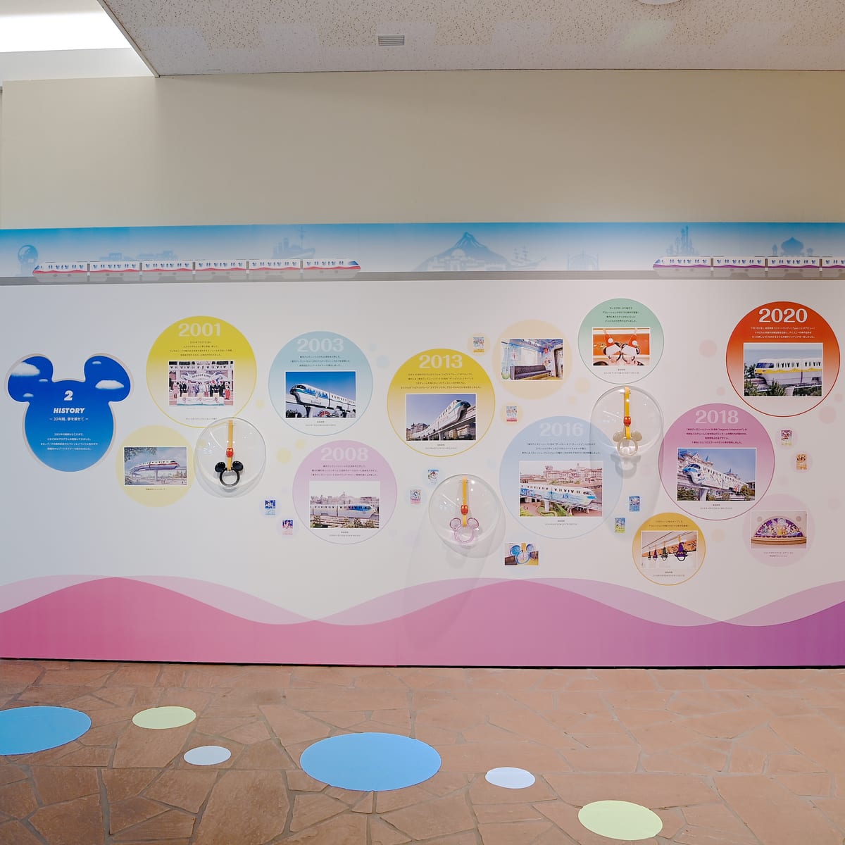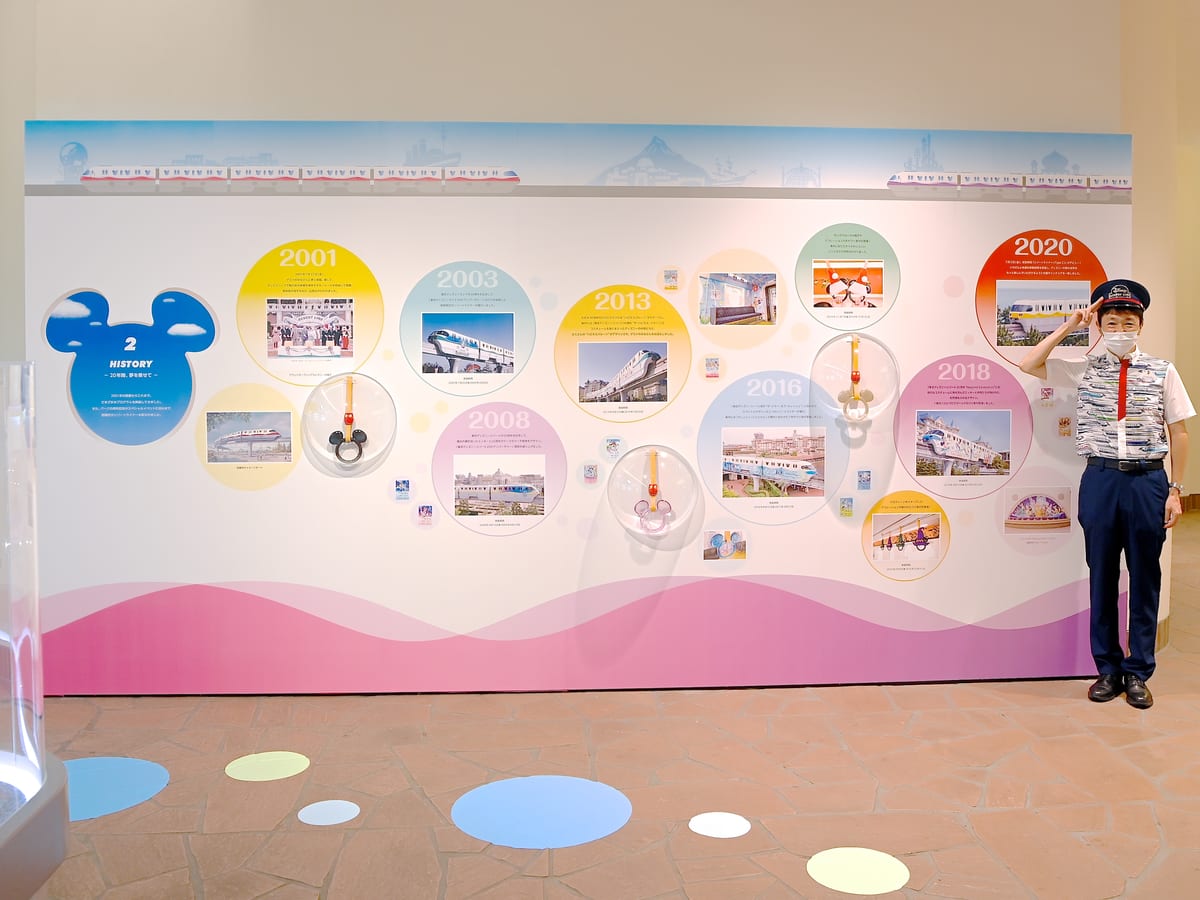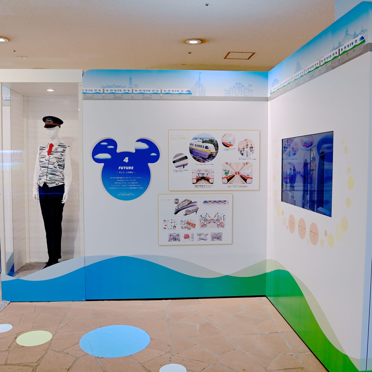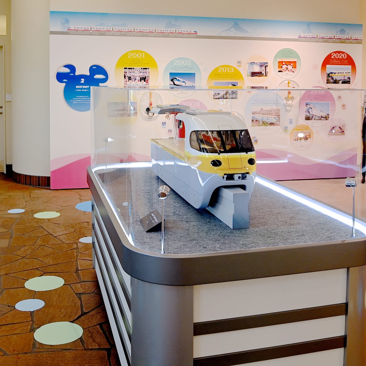 ディズニーリゾートラインの20年間のあゆみと、さらなる進化が感じられる展示がひろがります。