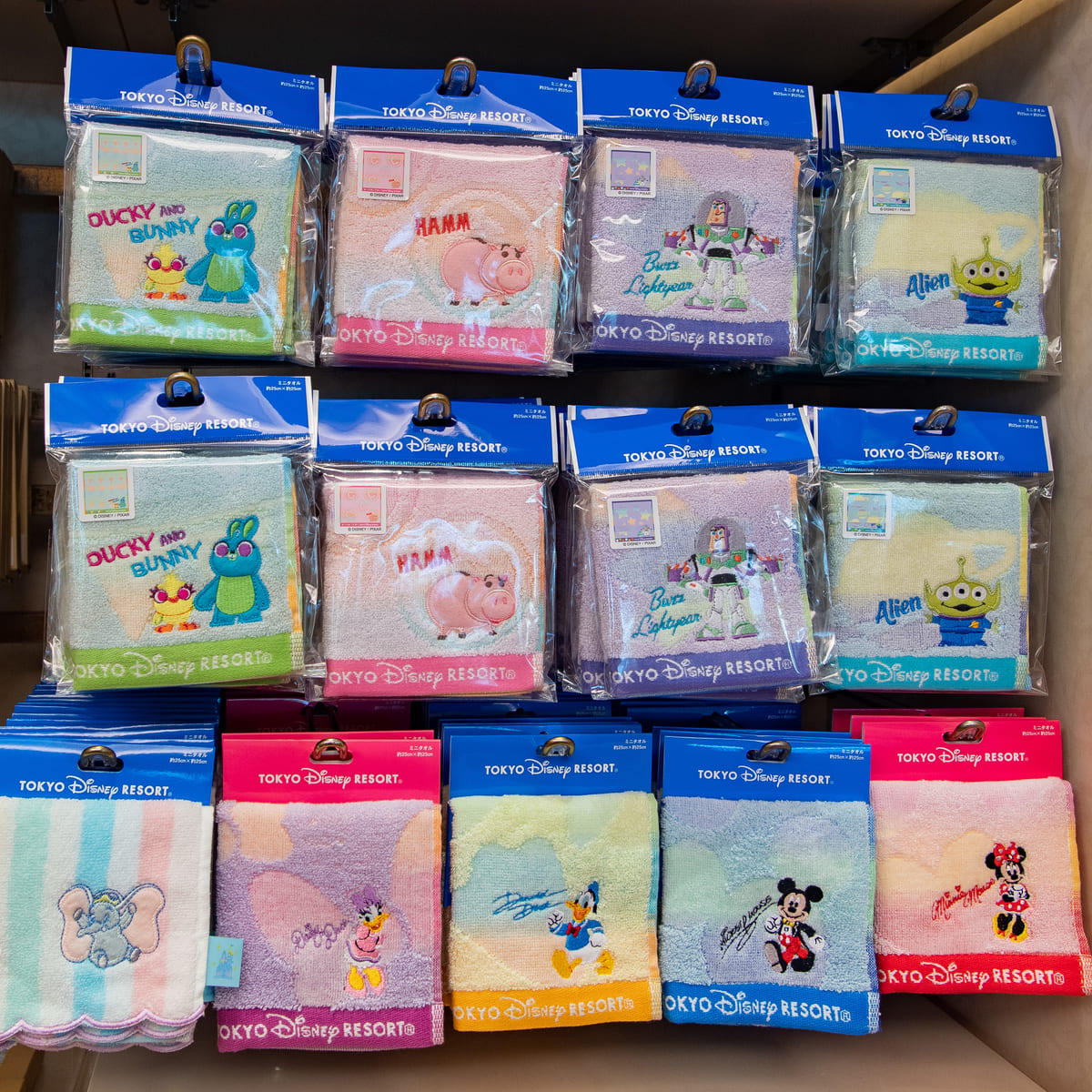 東京ディズニーランド、東京ディズニーシーの定番グッズ、ディズニーキャラクターデザインのミニタオル。