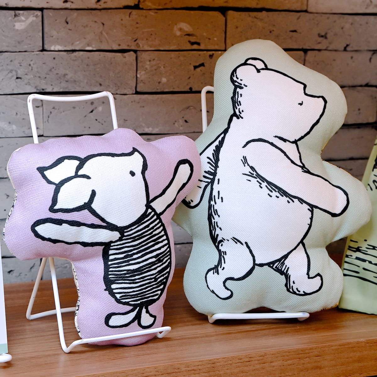 行進する「くまのプーさん」と「ピグレット」がデザインされたダイカットクッション。