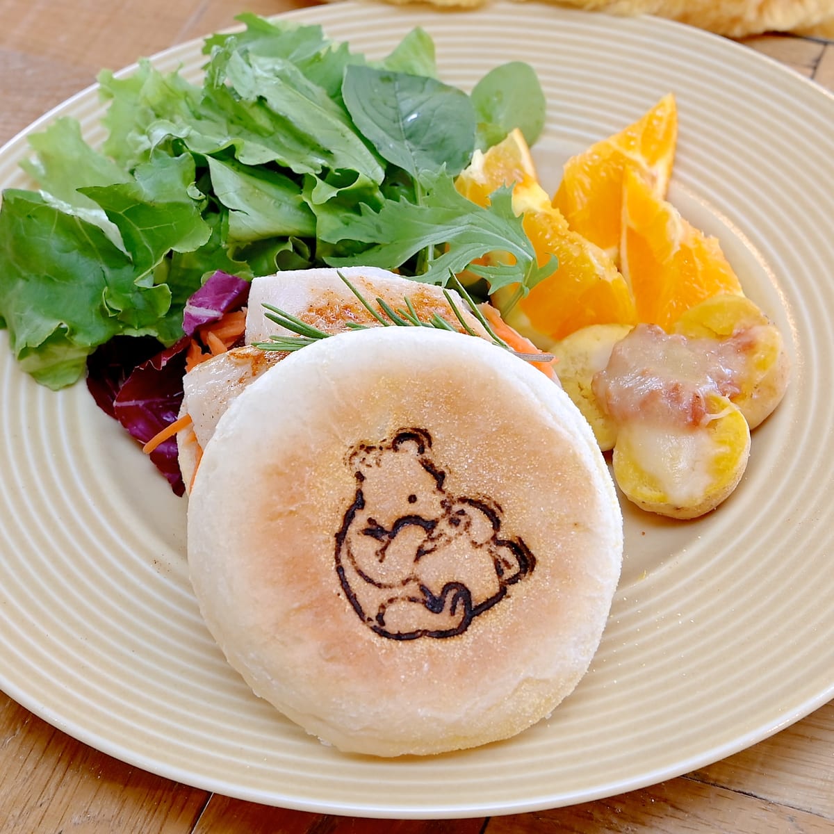 「くまのプーさん」の焼き印がかわいいマフィンにヘルシーなチキンとにんじんがサンドされています。