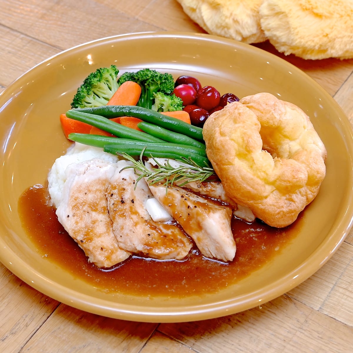 ローストしたチキン、ジャガイモ、ヨークシャー・プディングをワンプレートで提供。